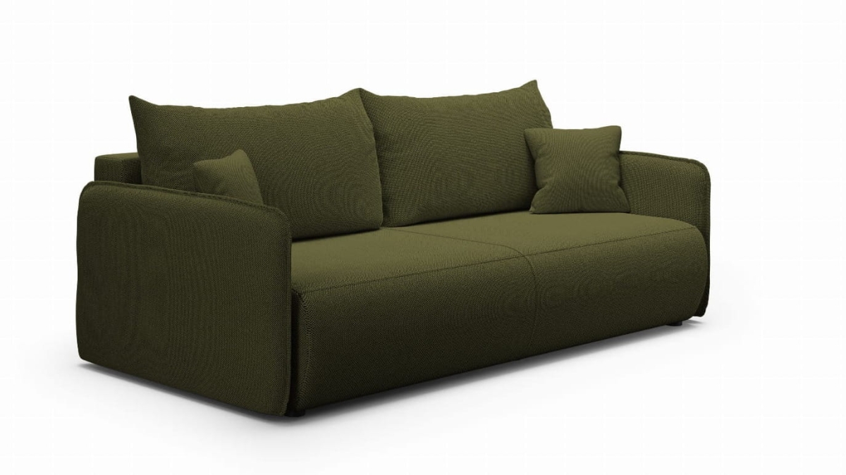 Wbudowany pojemnik na pościel ułatwia przechowywanie, a tapicerowany tył pozwala ustawić sofę także na środku pomieszczenia.