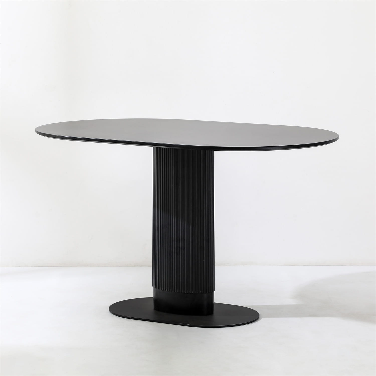 Płaska podstawa stołu to metal malowany proszkowo na czarno.