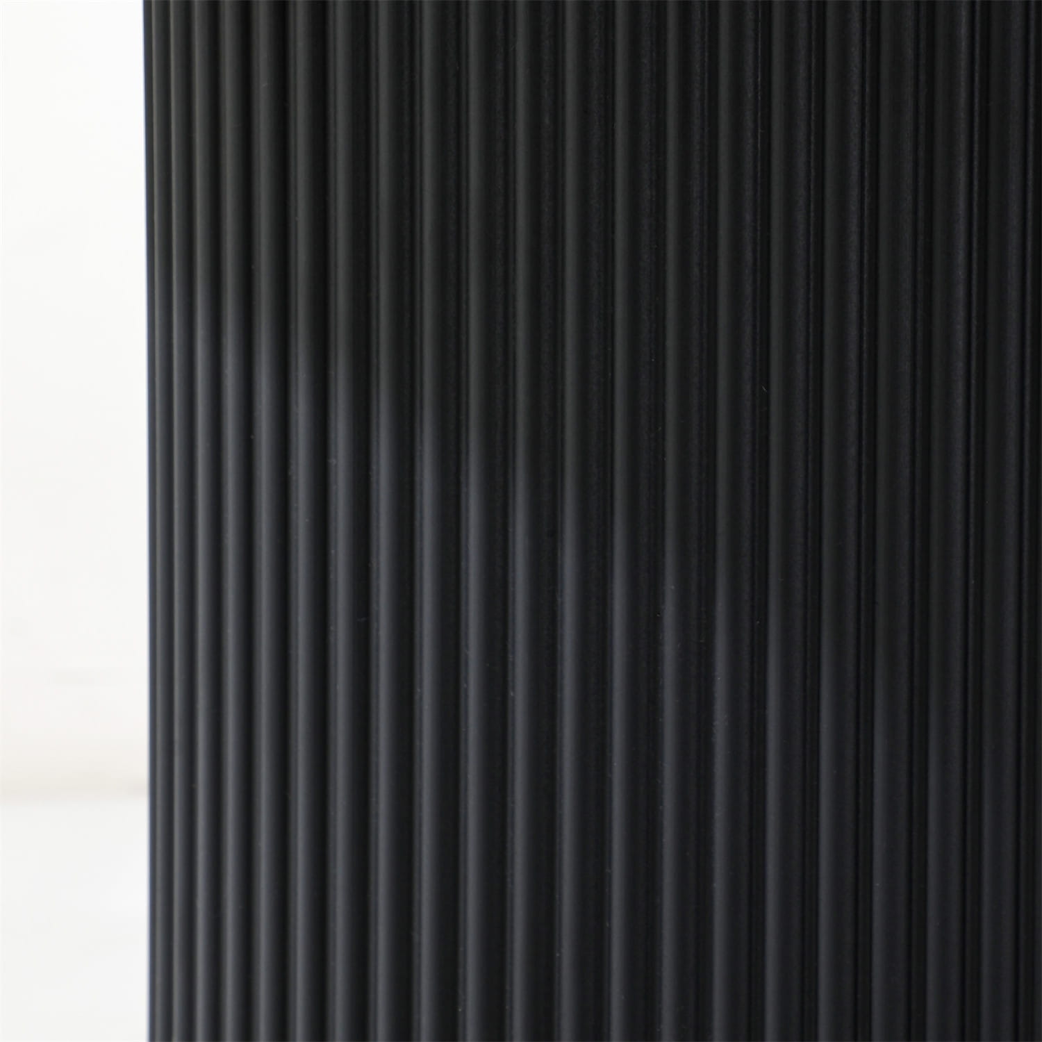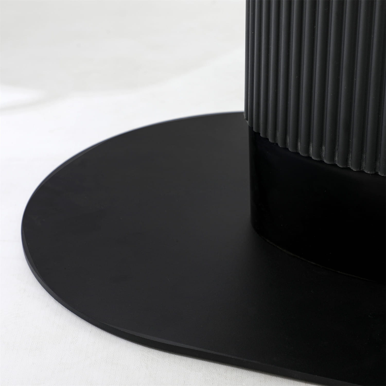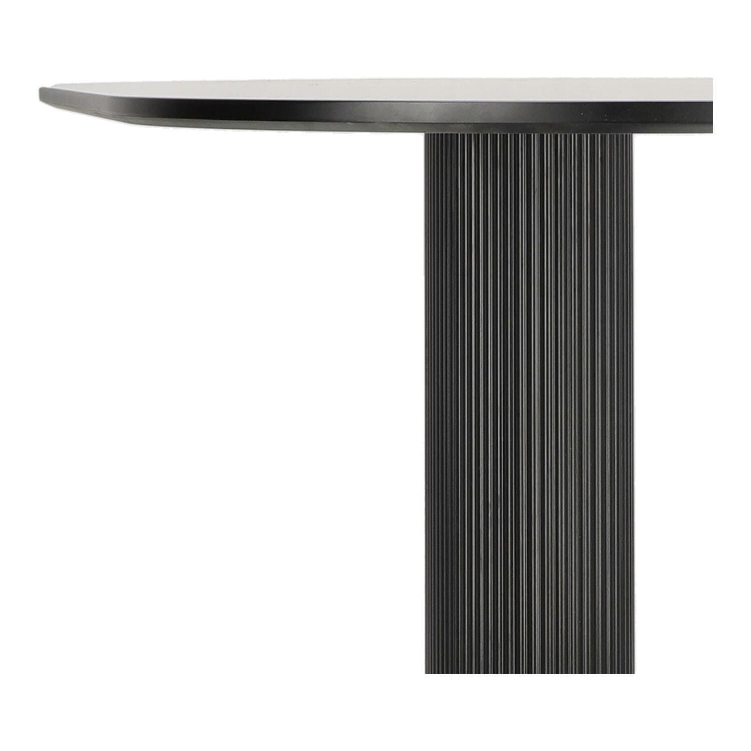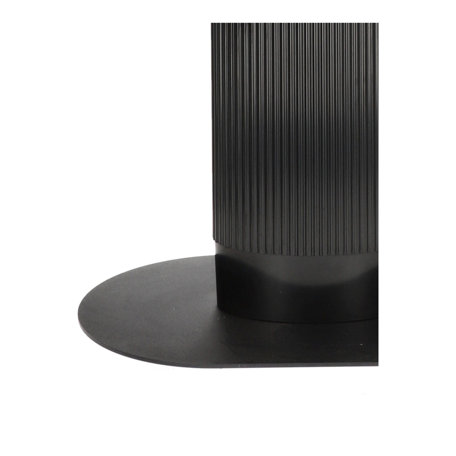 Noga stołu wykonana z metalu ozdobiona została pionowymi lamelami z tworzywa sztucznego, które dodają jej nowoczesnego wyglądu.