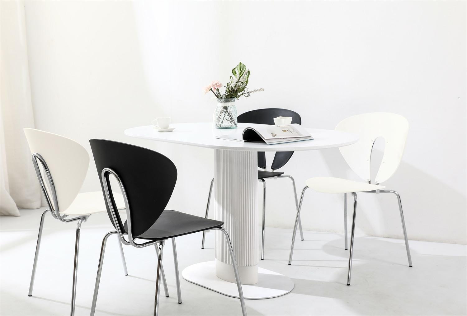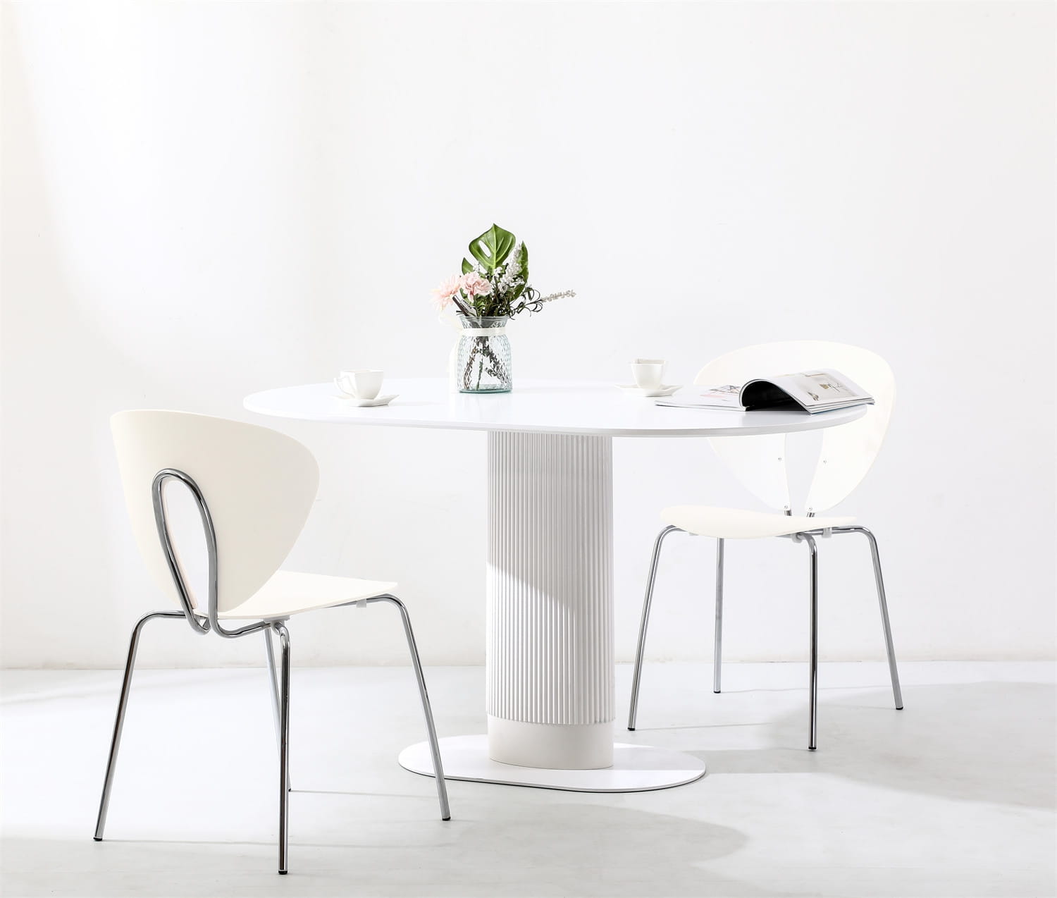 Blat stołu wykonany z wytrzymałej płyty MDF zachwyca swoim wyglądem, dzięki delikatnemu podcięciu, które dodaje mu lekkości.