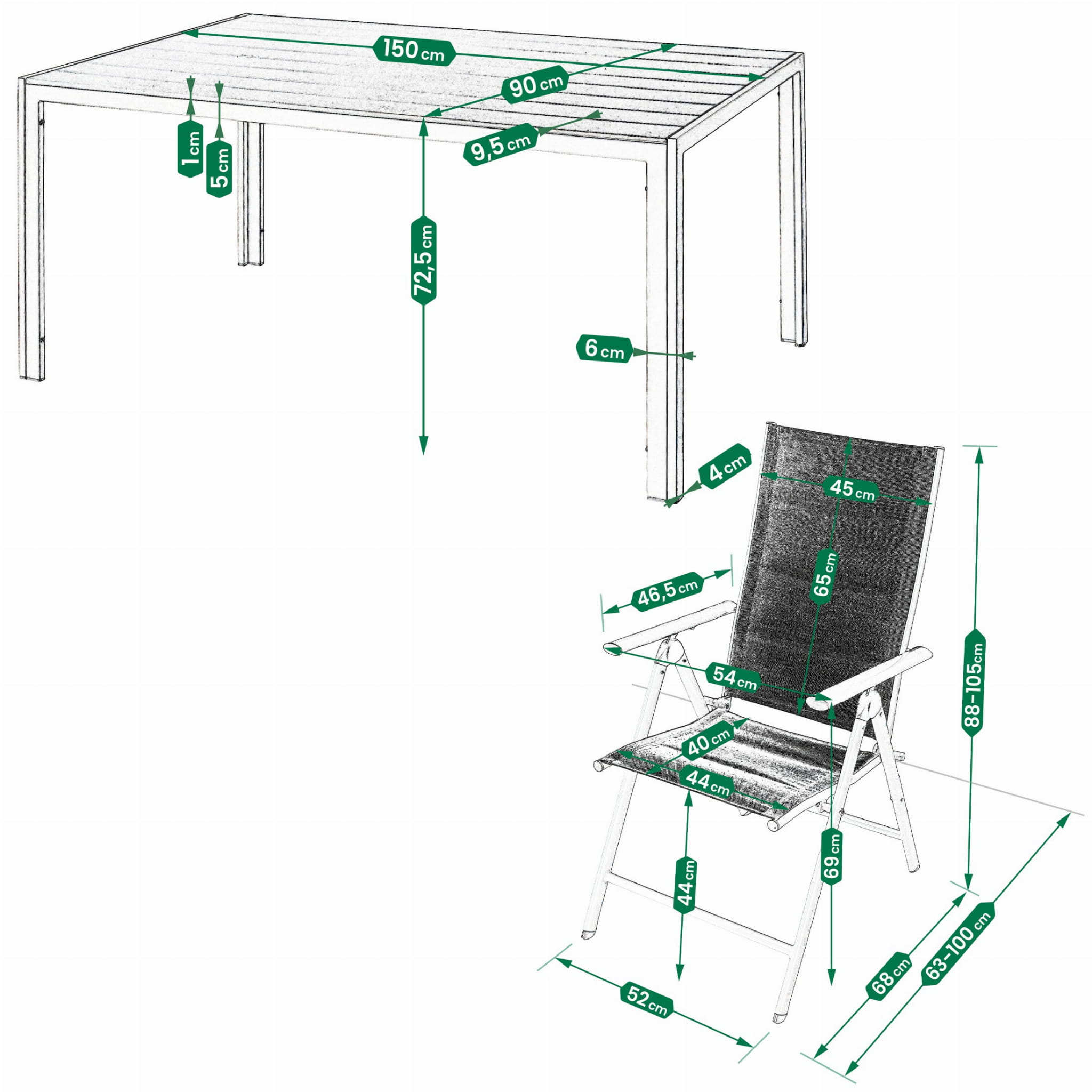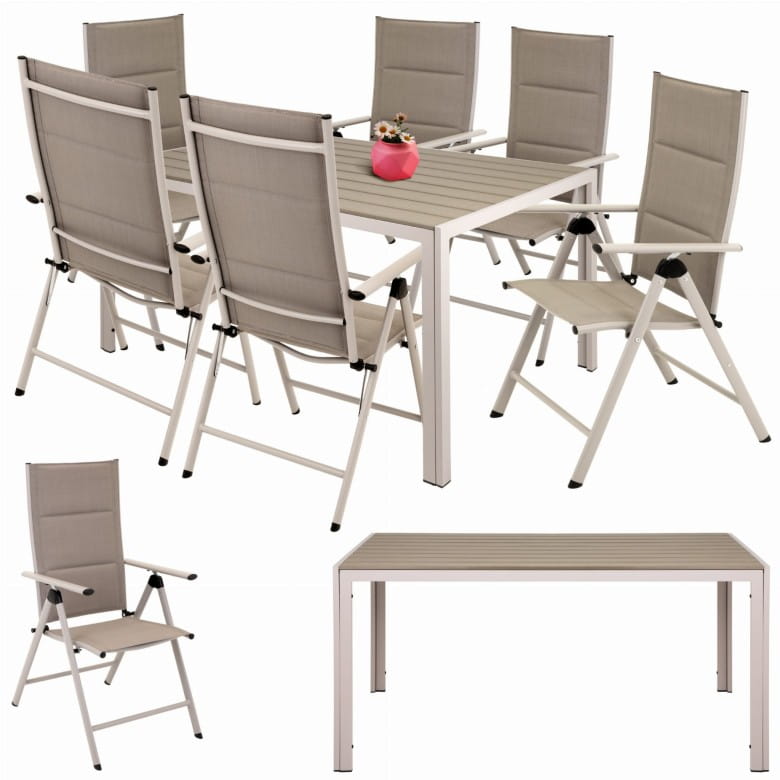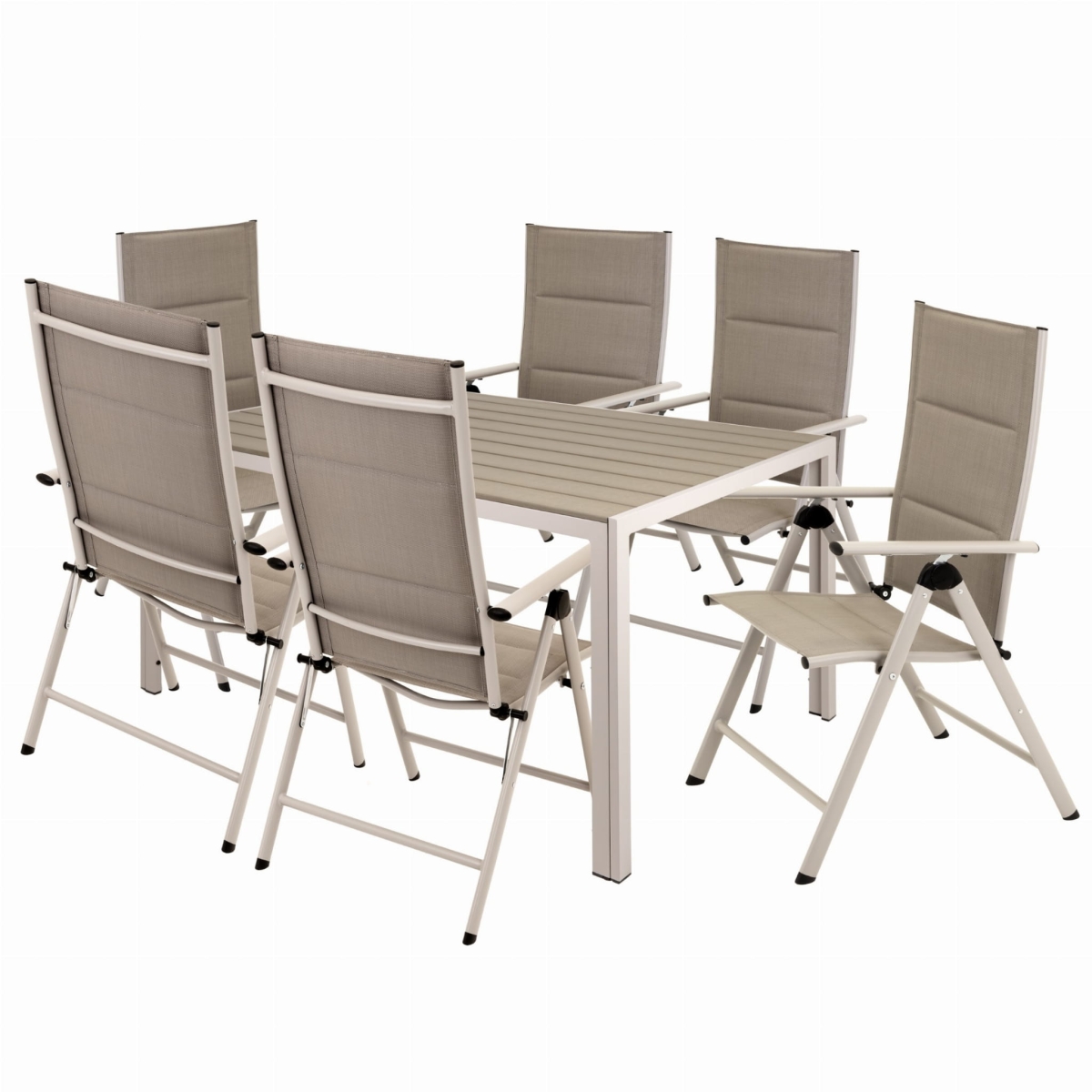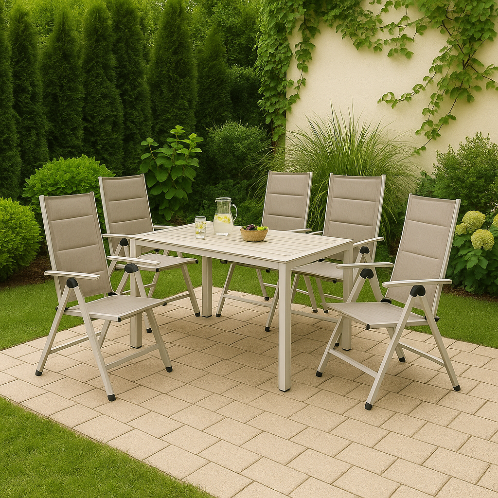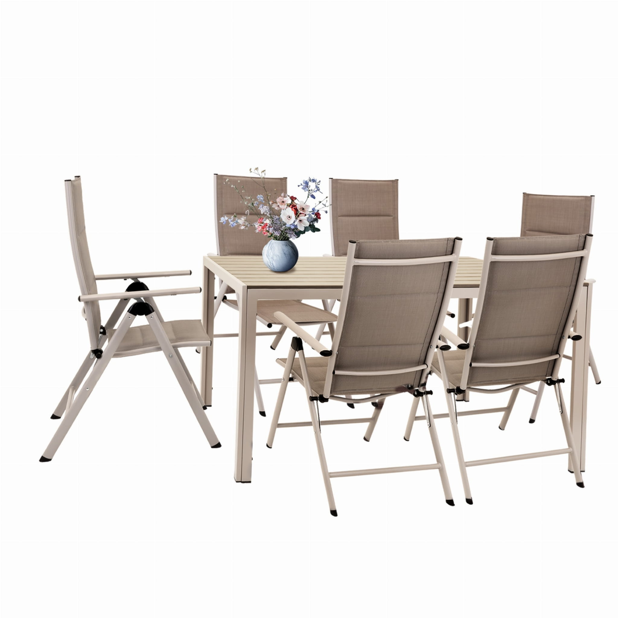 Stół ogrodowy z 6 krzesłami beżowy, regulowane oparcia, odporny na warunki atmosferyczne
