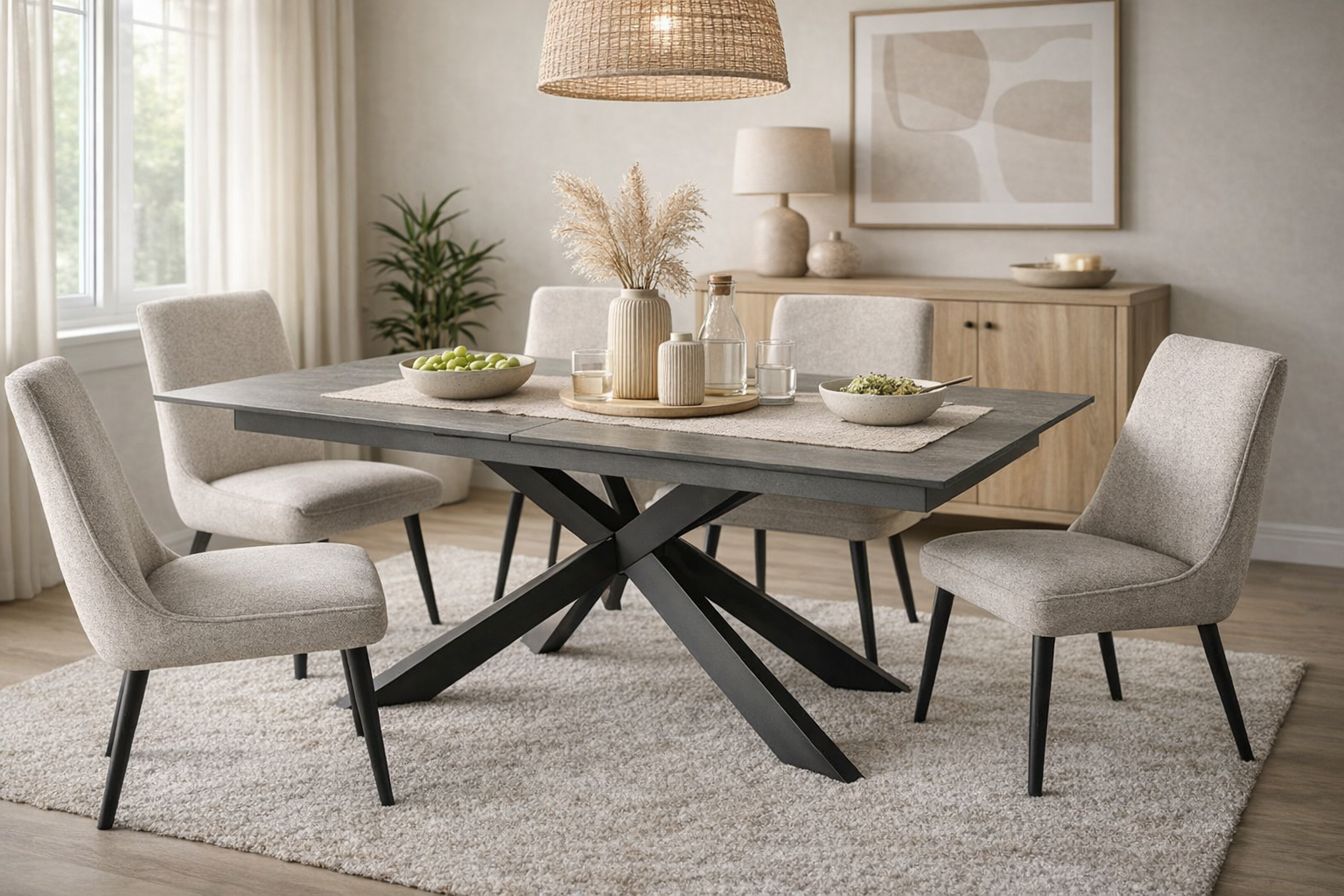 - Podstawa krzyżowa Czarna stal malowana proszkowo i wygodne miejsce dla 6/8 osób