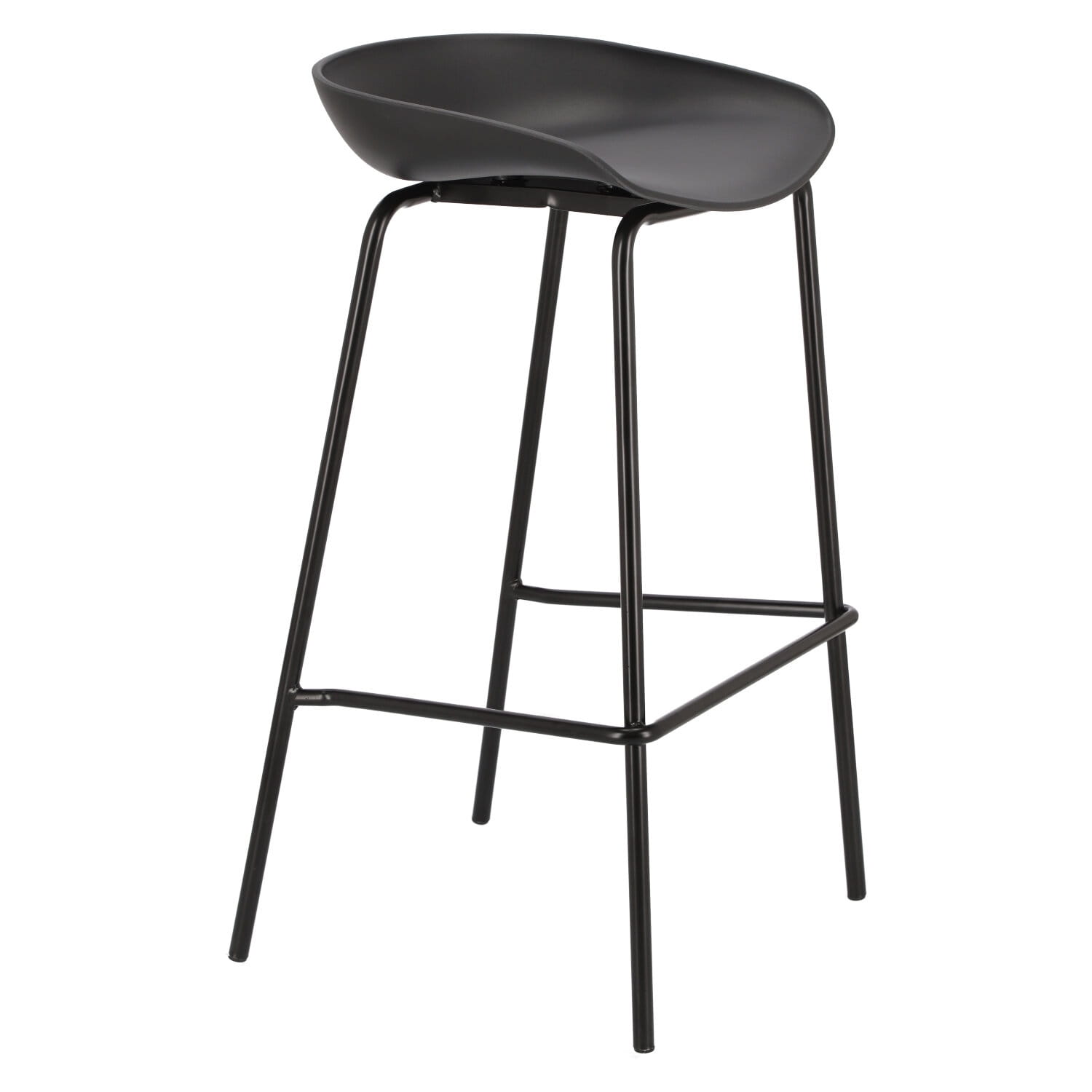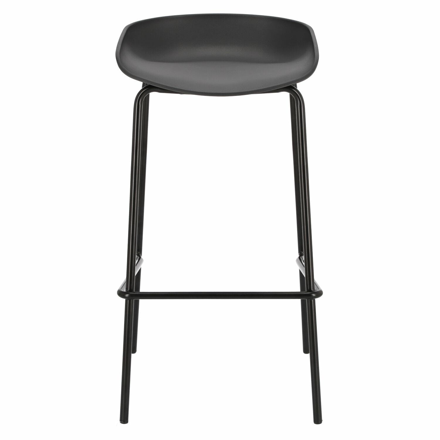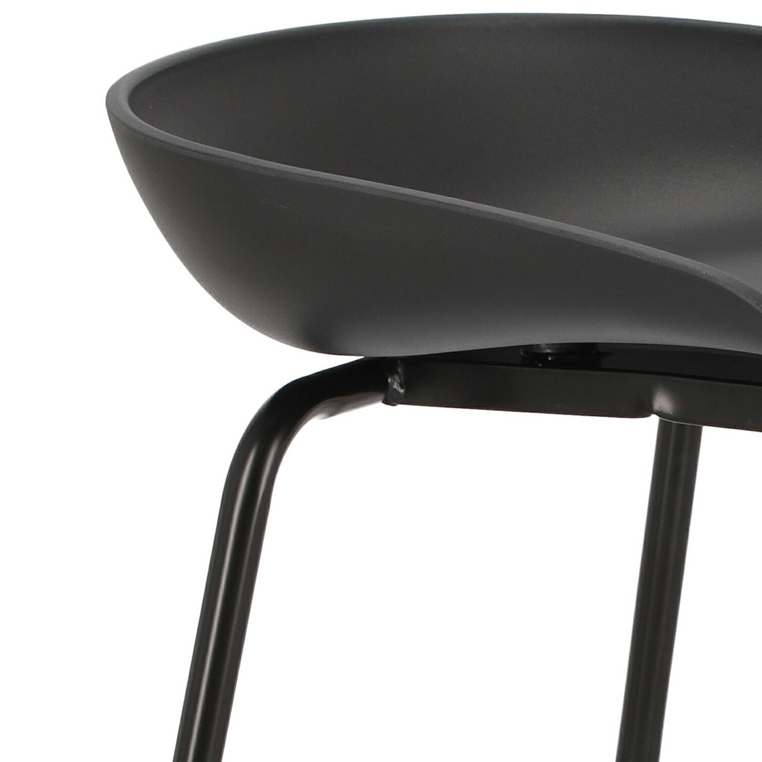 Czarne siedzisko z trwałego polipropylenu, który jest niezwykle odpornym tworzywem, spoczywa na czarnej metalowej podstawie, zapewniającej konstrukcji stabilne podparcie.