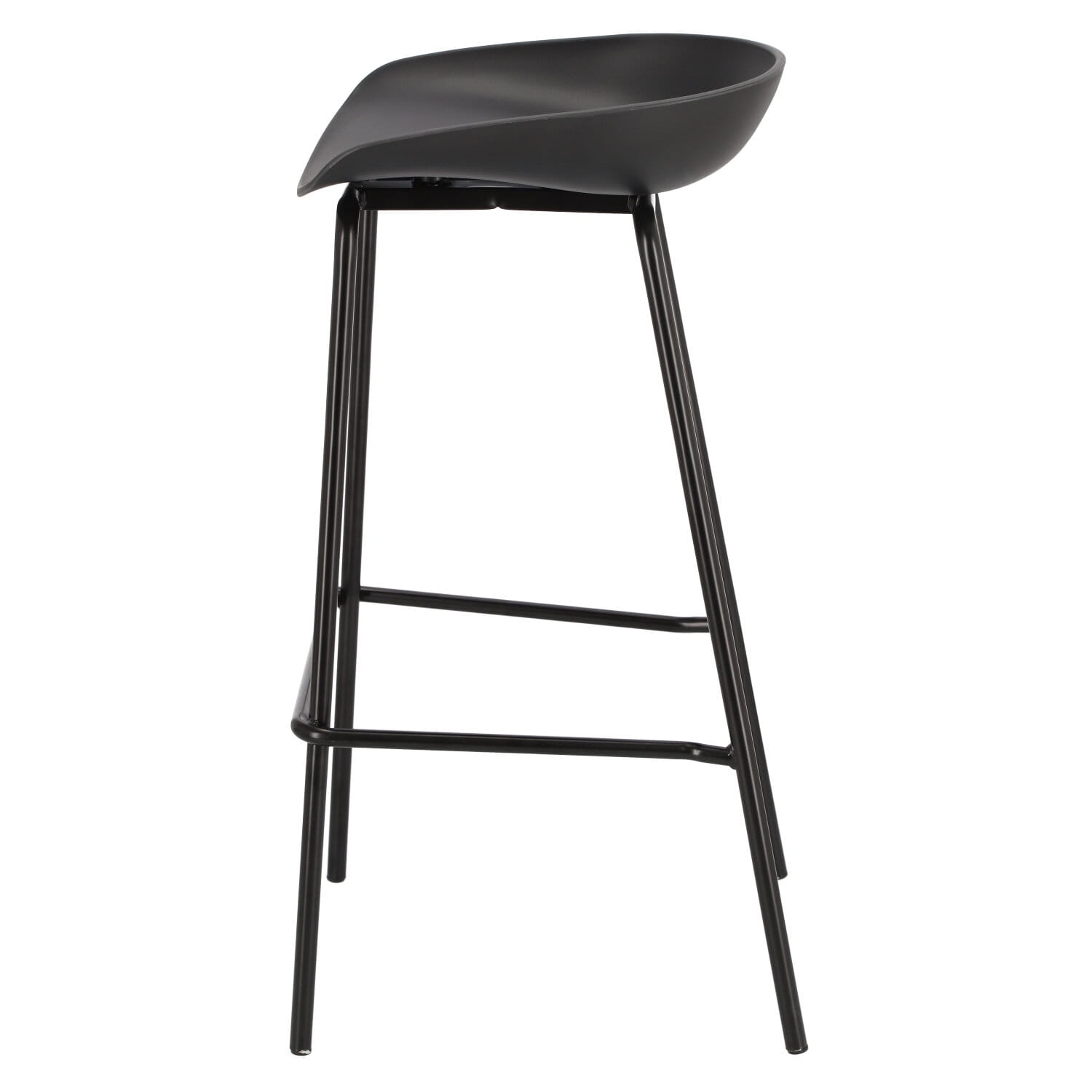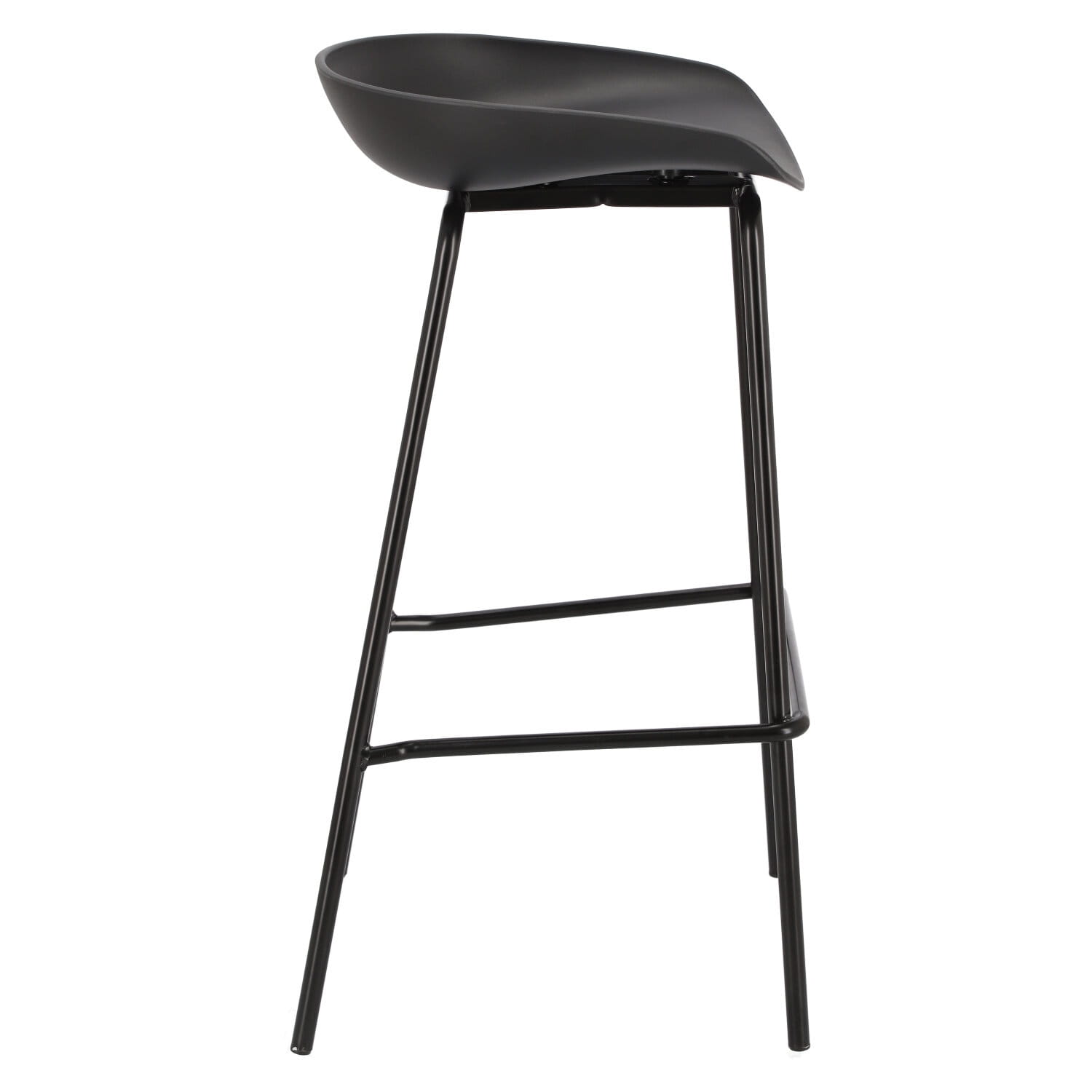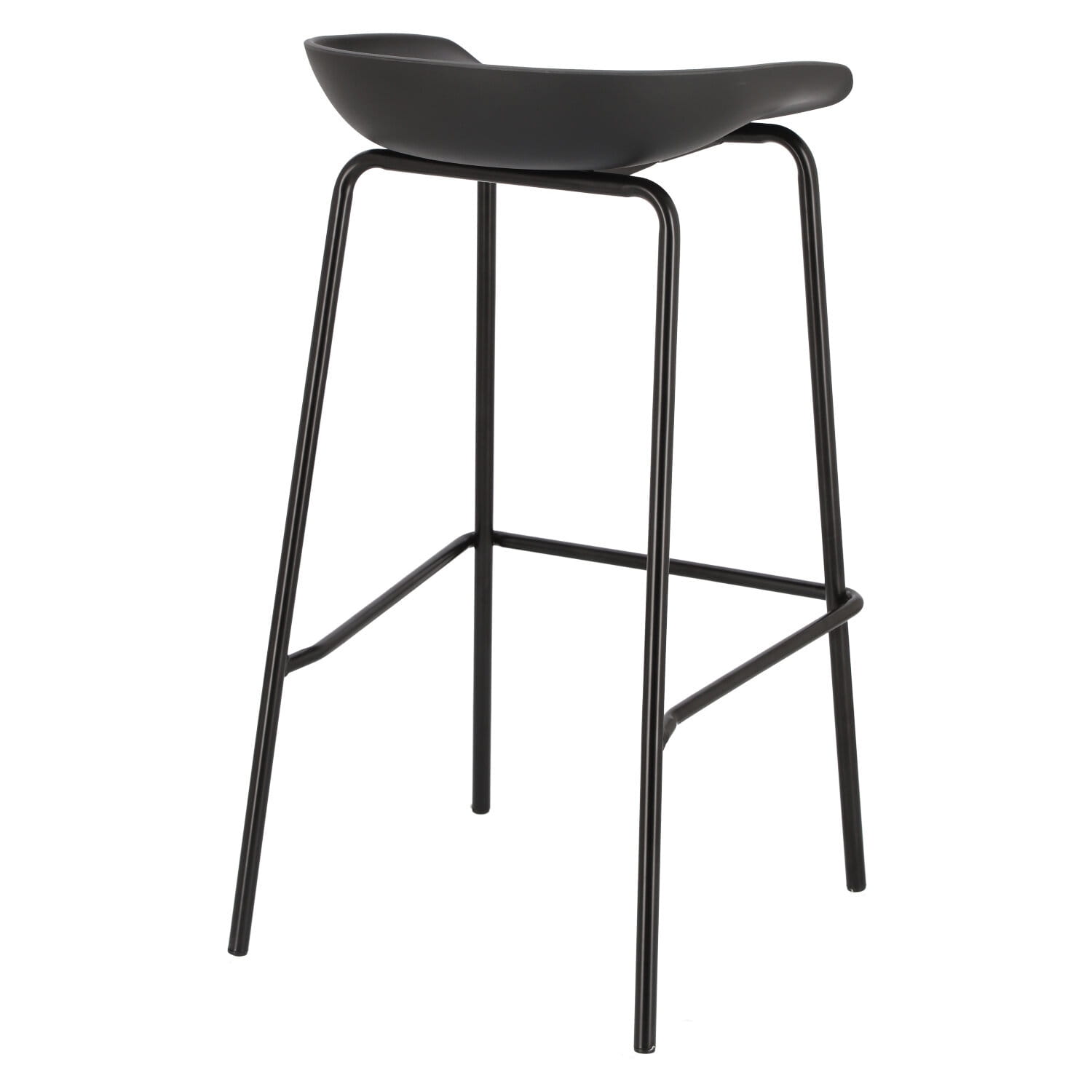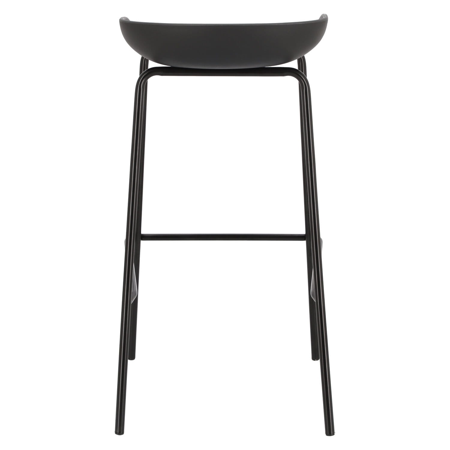 Czarne siedzisko z trwałego polipropylenu, który jest niezwykle odpornym tworzywem, spoczywa na czarnej metalowej podstawie, zapewniającej konstrukcji stabilne podparcie.