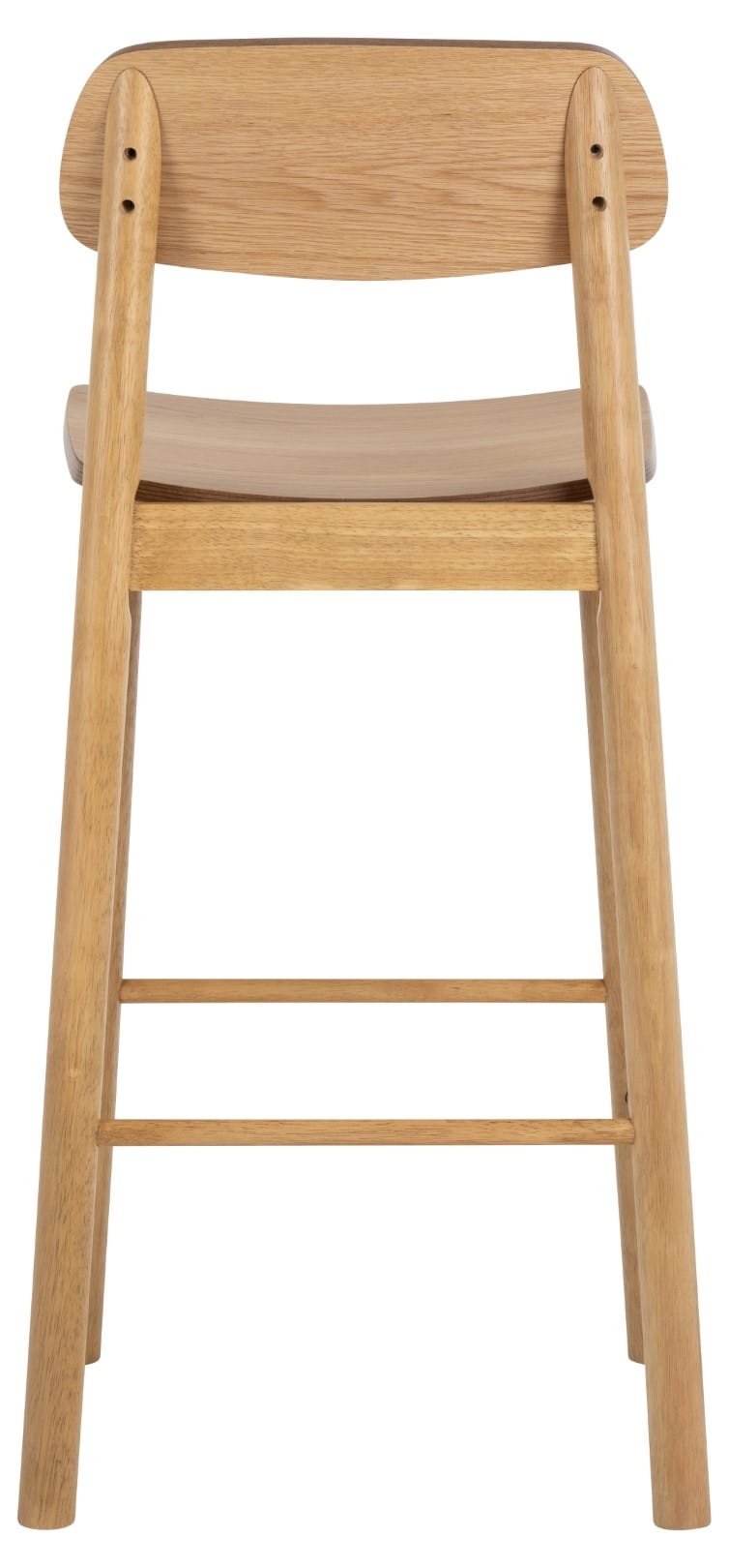 Siedzisko wykonano z lakierowanego forniru dębowego, który podkreśla usłojenie i nadaje stołkowi elegancki, ponadczasowy wygląd. Podstawa z lakierowanego drewna kauczukowego zapewnia stabilność i trwałość, a wygodny podnóżek zwiększa komfort codziennego użytkowania.