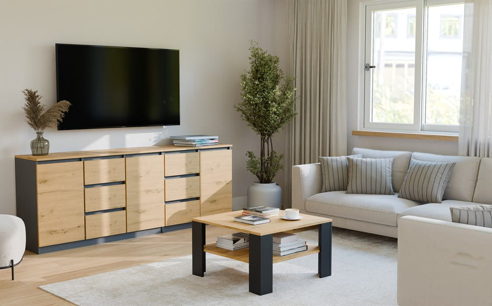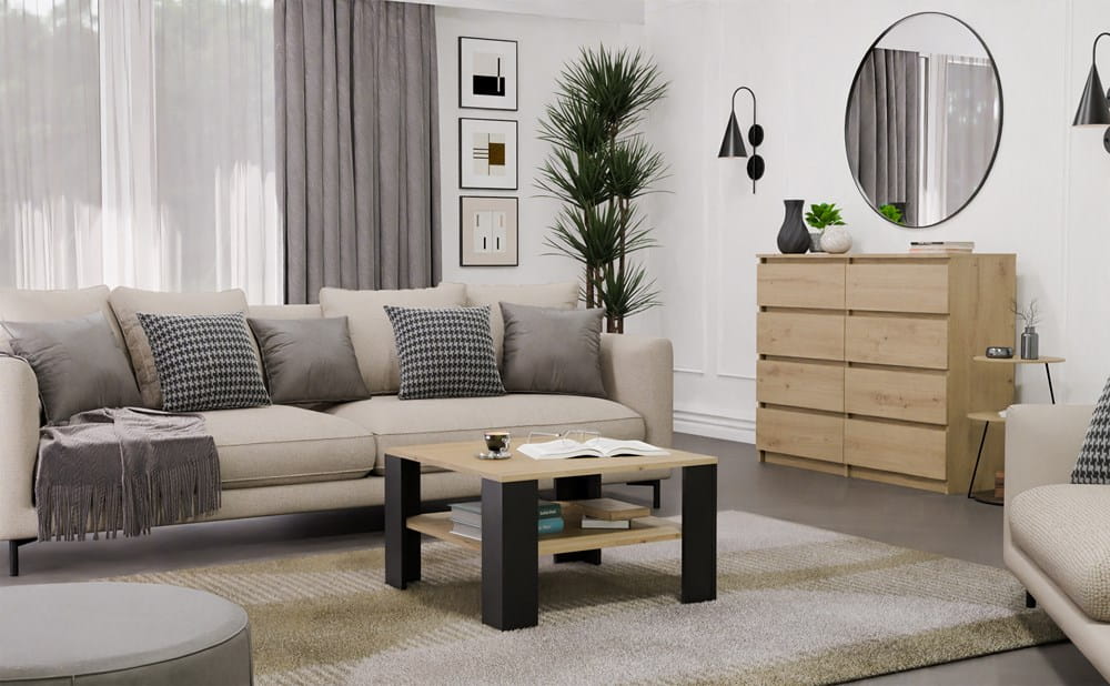 Ława SQUARE w kolorze Dąb Artisan / Czarny to stylowy i funkcjonalny mebel, który doskonale sprawdzi się jako stolik kawowy do salonu. Połączenie ciepłego dekoru drewna z czarnymi elementami nadaje wnętrzu nowoczesny, a zarazem ponadczasowy charakter.