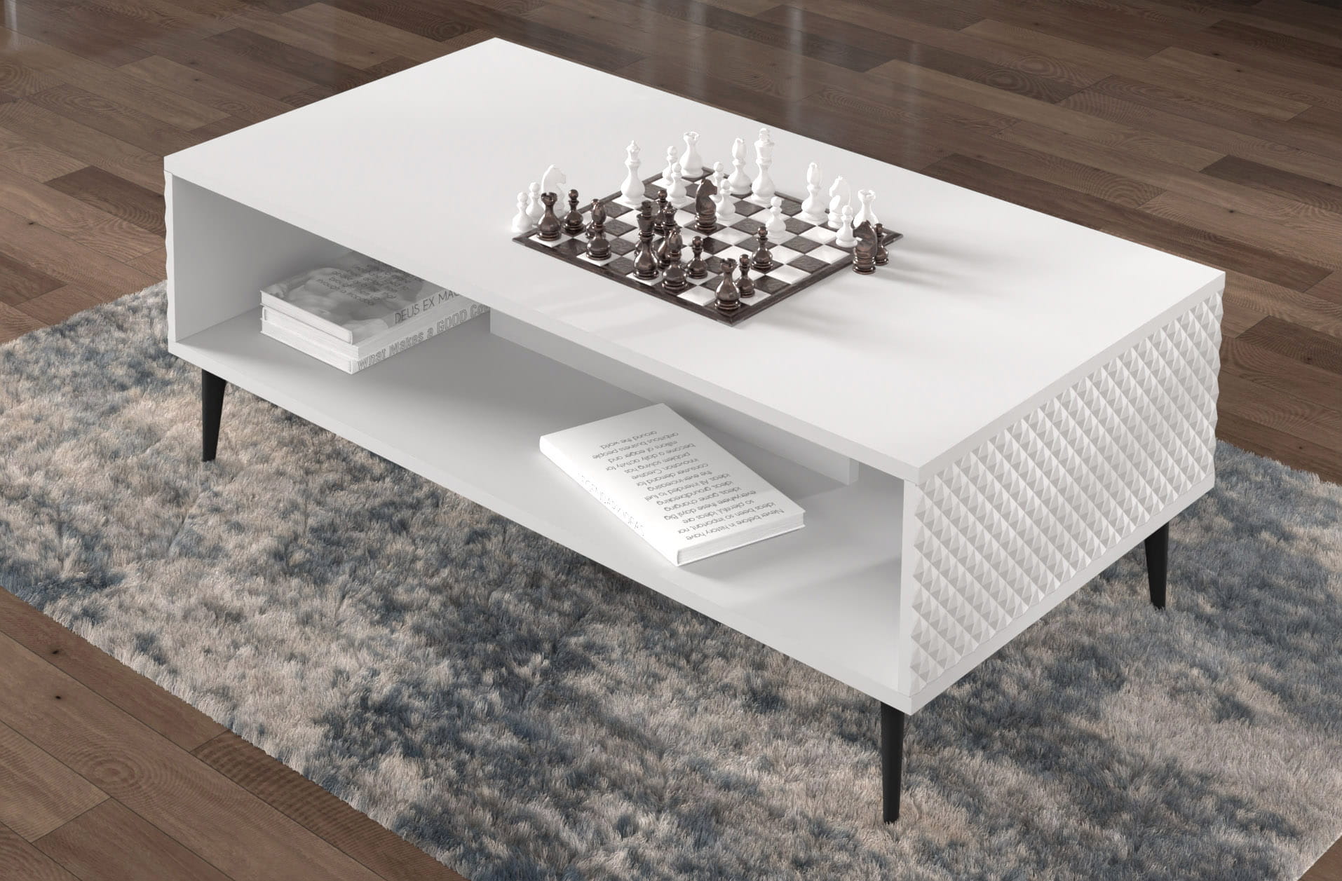 Stolik kawowy biały matowy 90x60 cm, na czarnych szpilkach Ravenna PC Diament