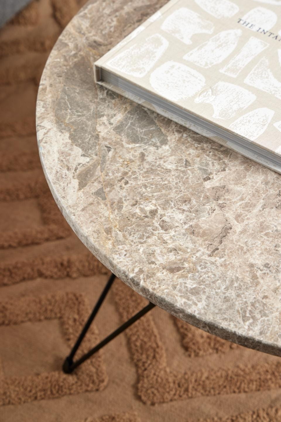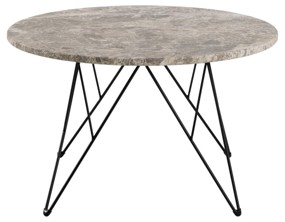 Jego wyjątkowy blat z lakierowanego szaro-brązowego marmuru Spider zachwyca unikalnym rysunkiem naturalnych żyłek, a czarna, druciana podstawa ze stali malowanej proszkowo dodaje mu lekkości i charakteru.
