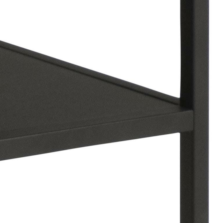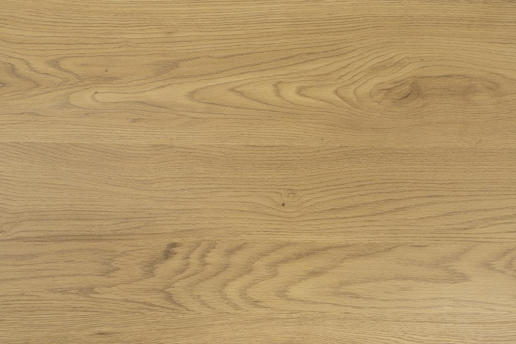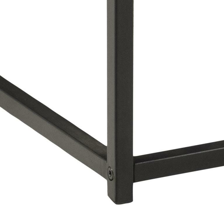 Posiada prostokątny blat z płyty MDF w okleinie dębowej, pod którym znajduje się czarna półka.