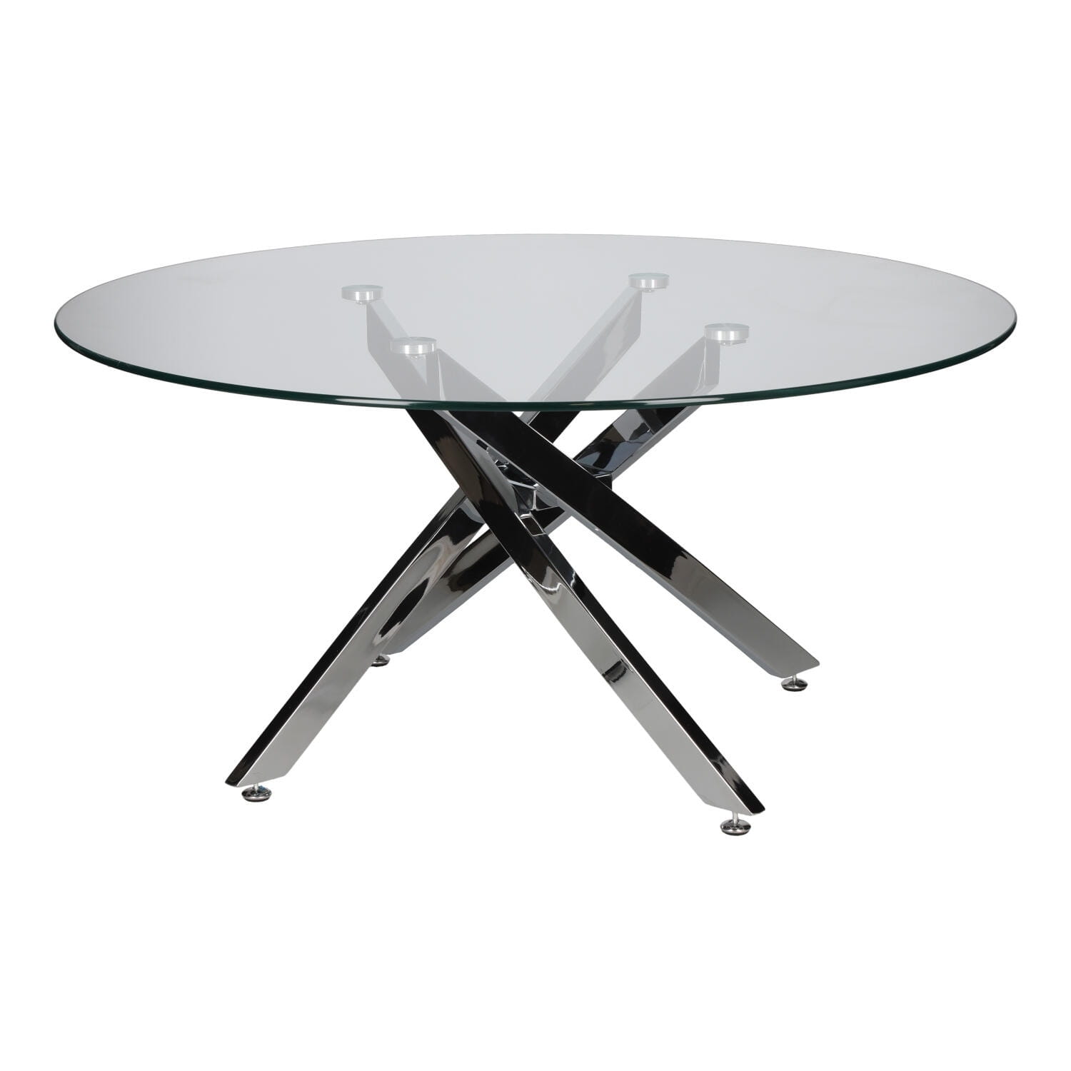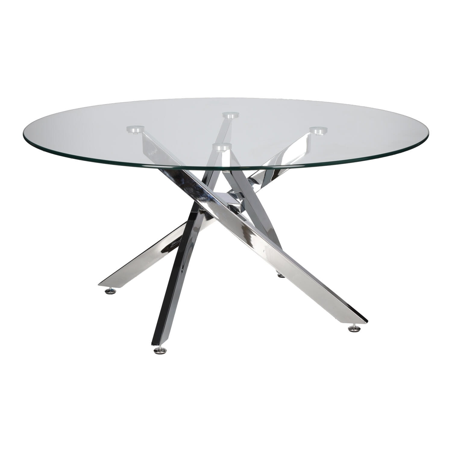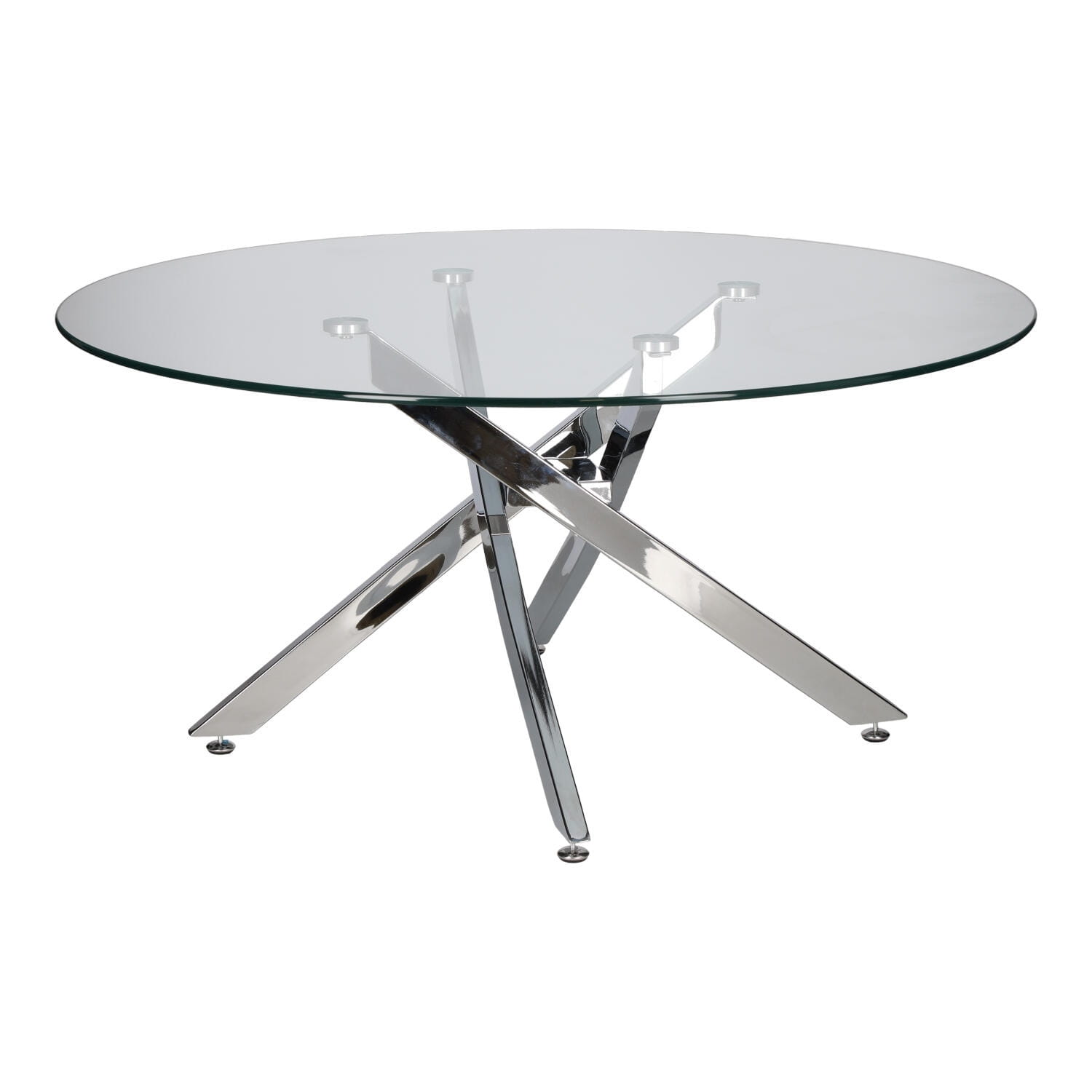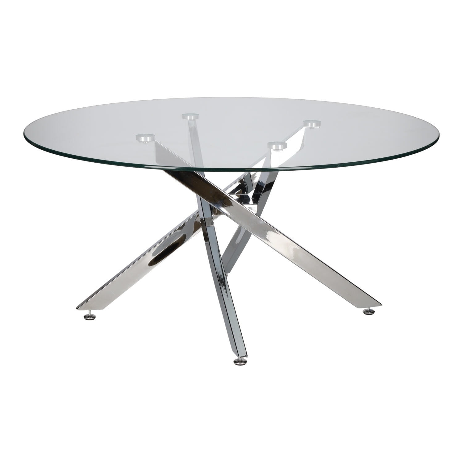 Jego okrągły blat wykonany z 8 mm hartowanego szkła zapewnia trwałość i łatwość w utrzymaniu czystości, a chromowane nogi na wysoki połysk dodają mu nowoczesnego charakteru.