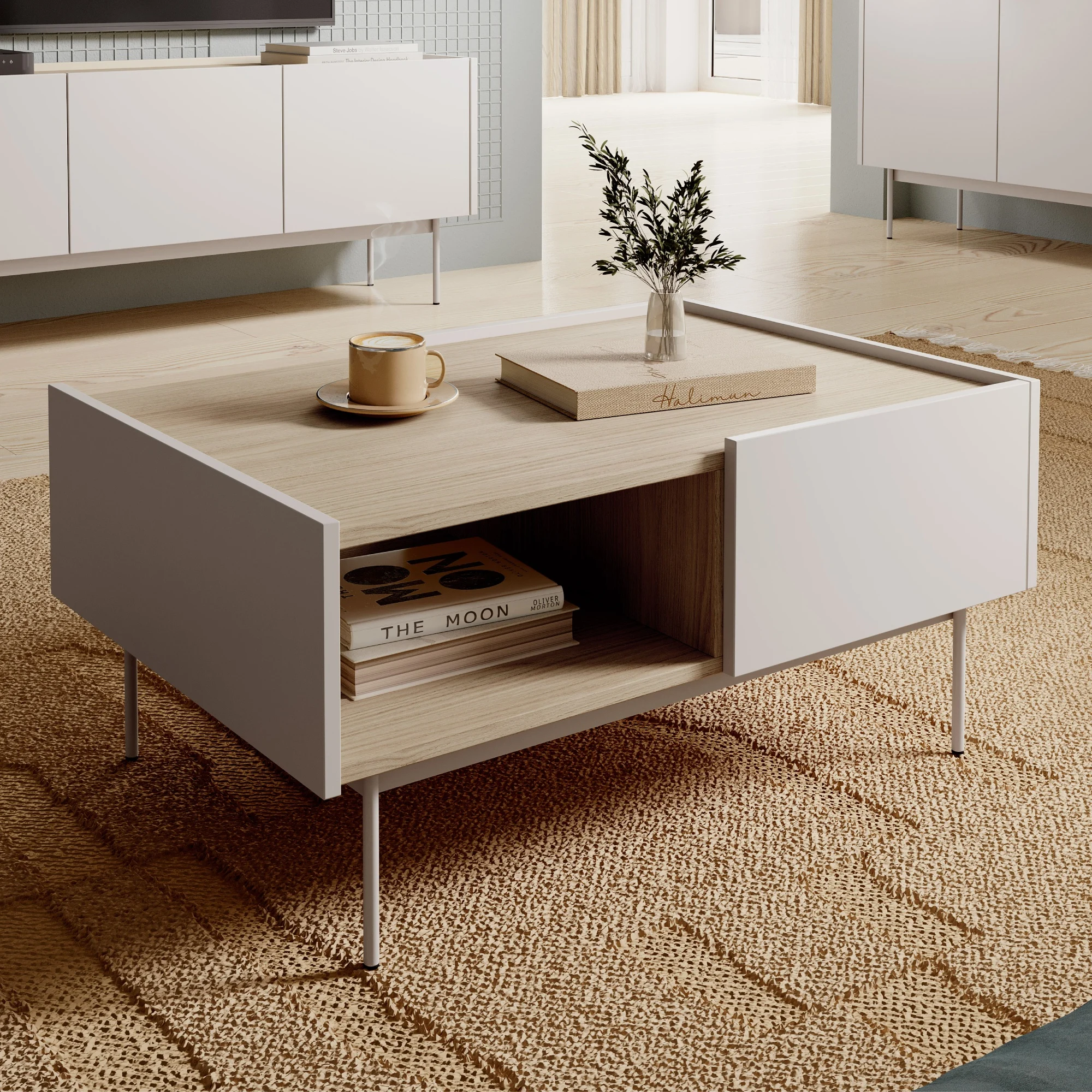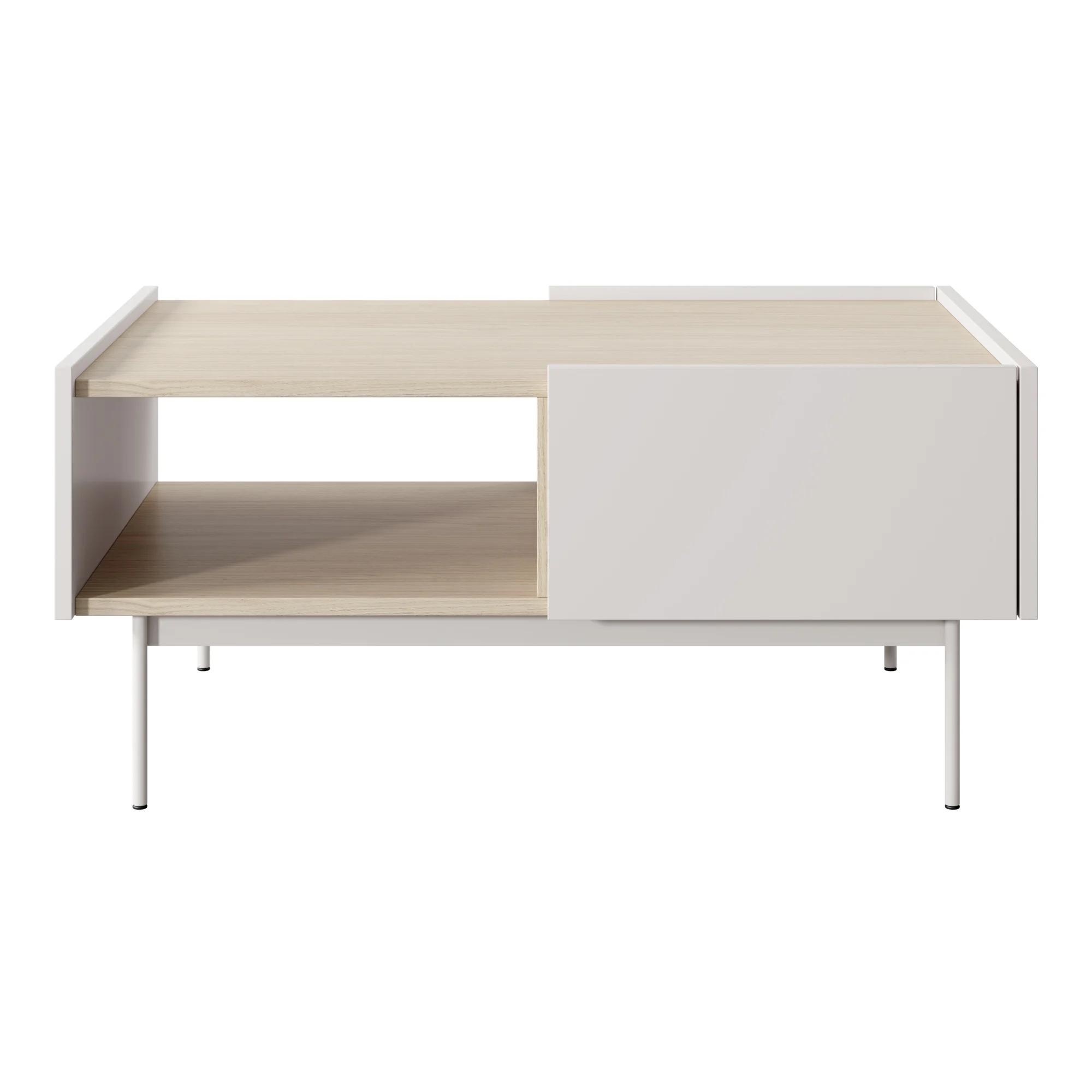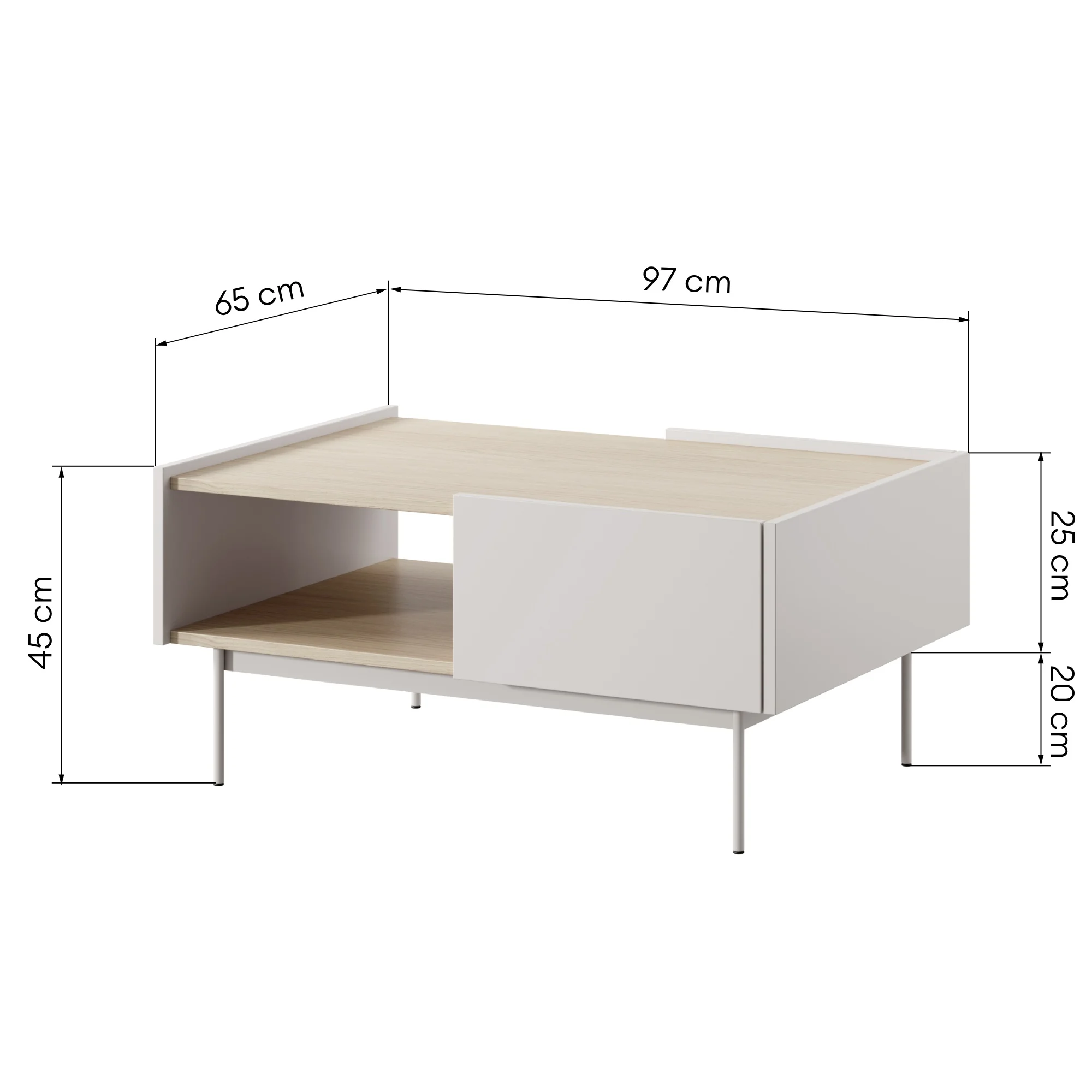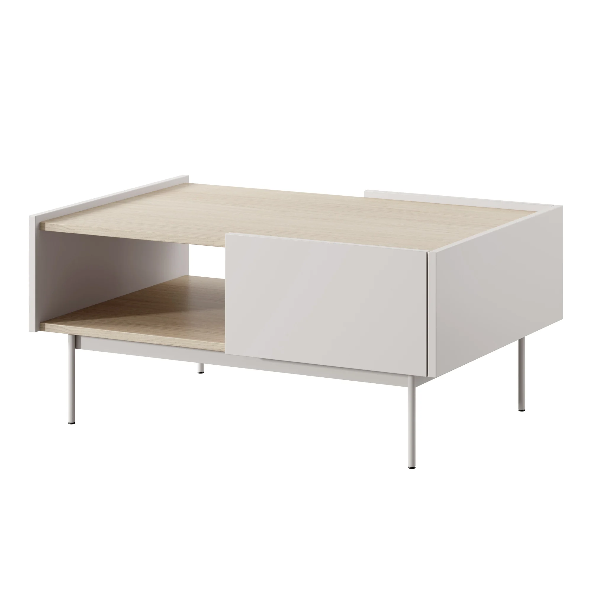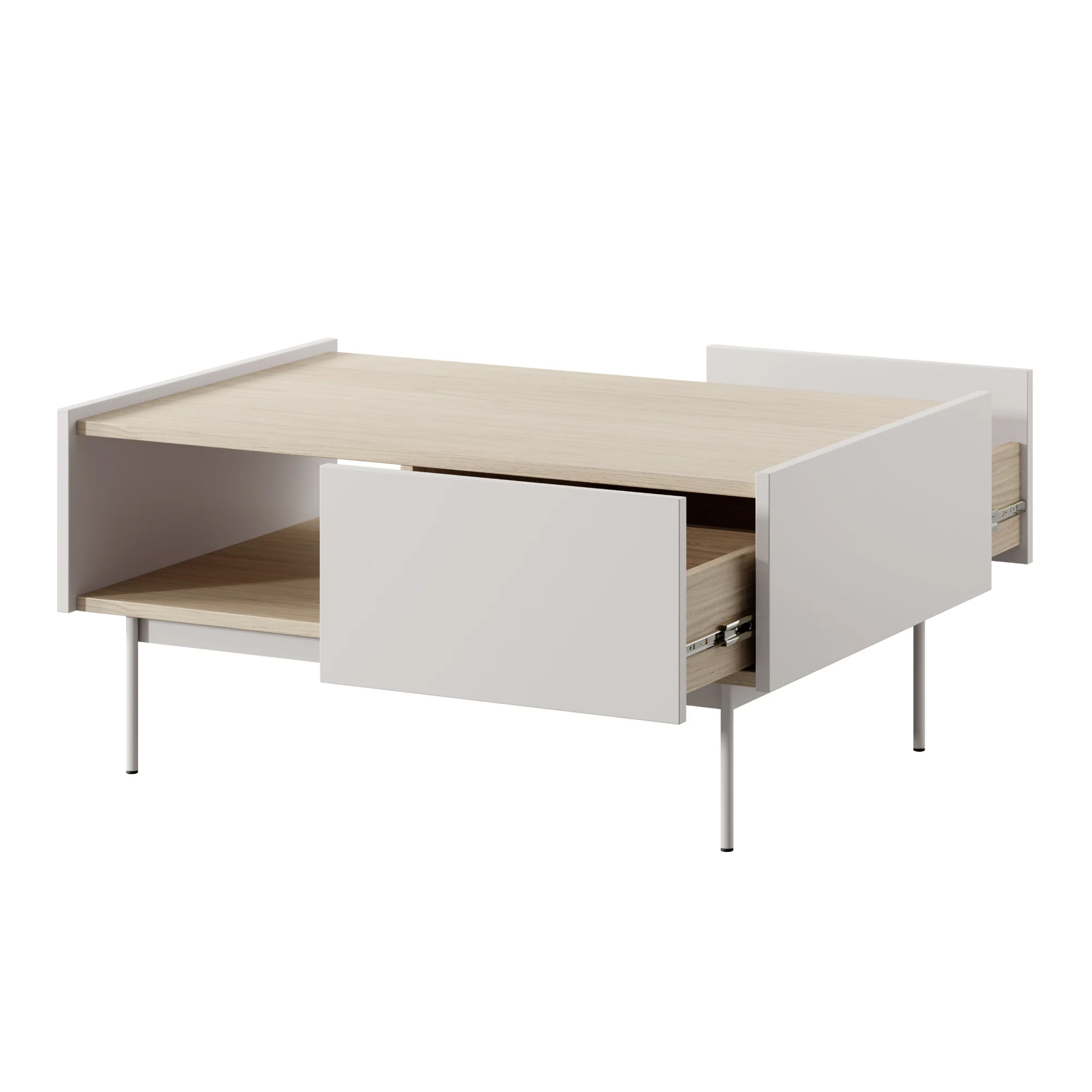 Elegancja i harmonia designu: Stolik kawowy Color wyróżnia się subtelnością beżowego odcienia konstrukcji, który doskonale komponuje się z wykończeniem blatu w odcieniu dębu linea, tworząc harmonijny wygląd.