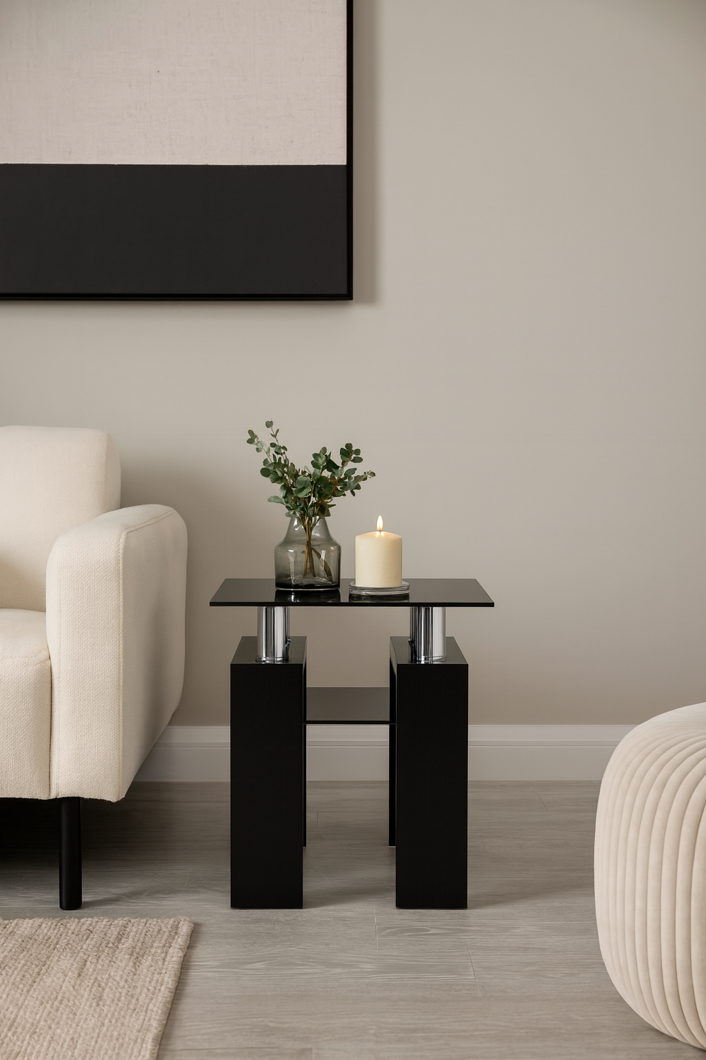 Stabilne nogi z MDF-u lakierowanego w kolorze czarnym nadają całości elegancji oraz zapewniają trwałość konstrukcji. Dzięki swojej formie stolik idealnie sprawdzi się zarówno w roli ławy kawowej, jak i praktycznego miejsca na dekoracje, książki czy napoje.