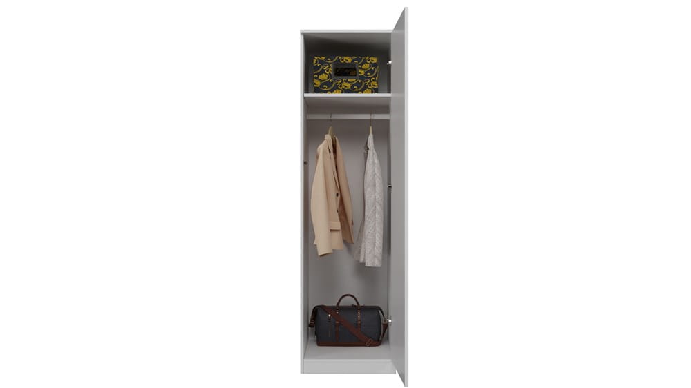 Model wyposażono w innowacyjny system TIP-ON, który umożliwia otwieranie drzwi po delikatnym naciśnięciu frontu – bez potrzeby stosowania uchwytów. Dodatkowo, podczas montażu można zdecydować, czy wewnątrz znajdą się półki, czy drążek na ubrania – w zależności od potrzeb.
