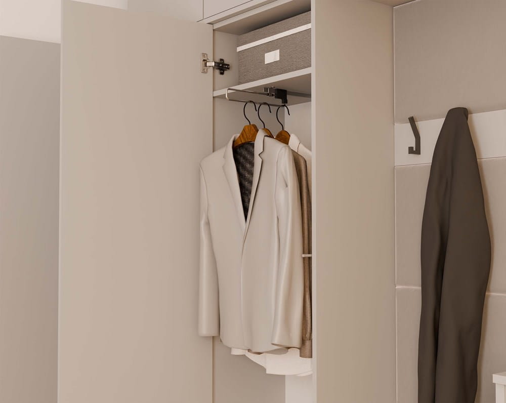 Dzięki modułowej konstrukcji, szafa HAGA pozwala tworzyć indywidualne zestawy – możesz z łatwością połączyć ją z innymi elementami serii, takimi jak wieszak czy dodatkowe segmenty, by stworzyć spójną i funkcjonalną przestrzeń w przedpokoju.