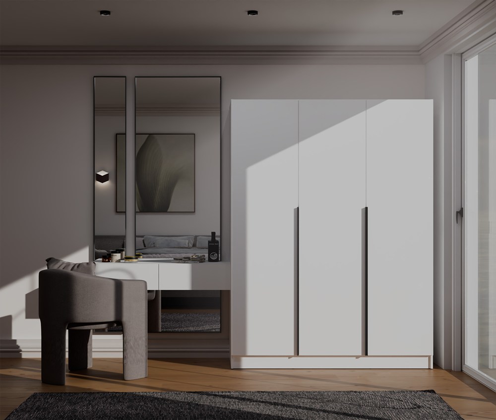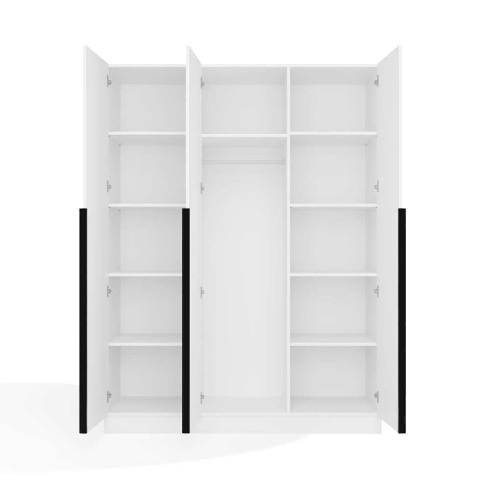 Trzydrzwiowa konstrukcja zapewnia wygodny dostęp do całego wnętrza szafy, a przemyślany układ półek ułatwia codzienne przechowywanie ubrań, pościeli, dokumentów, pudełek i dodatków.