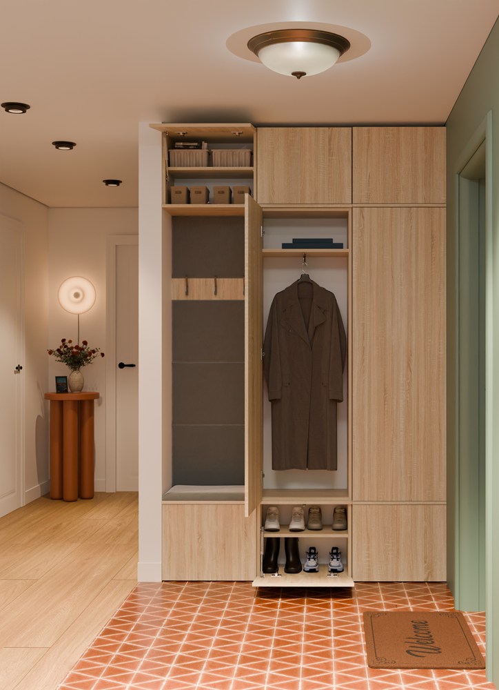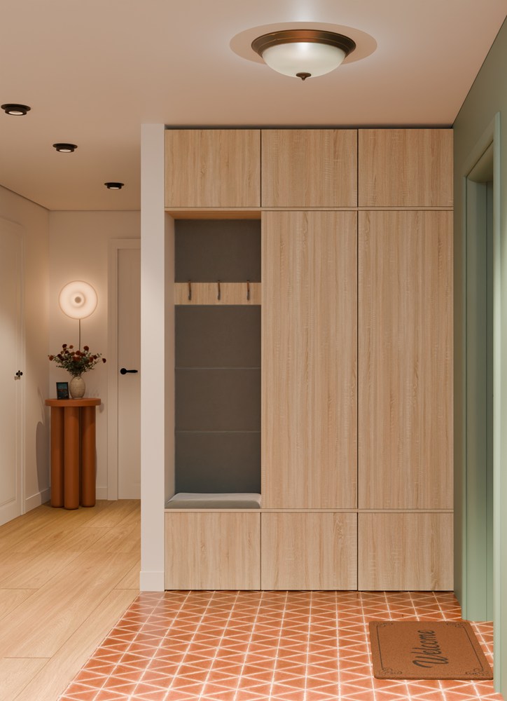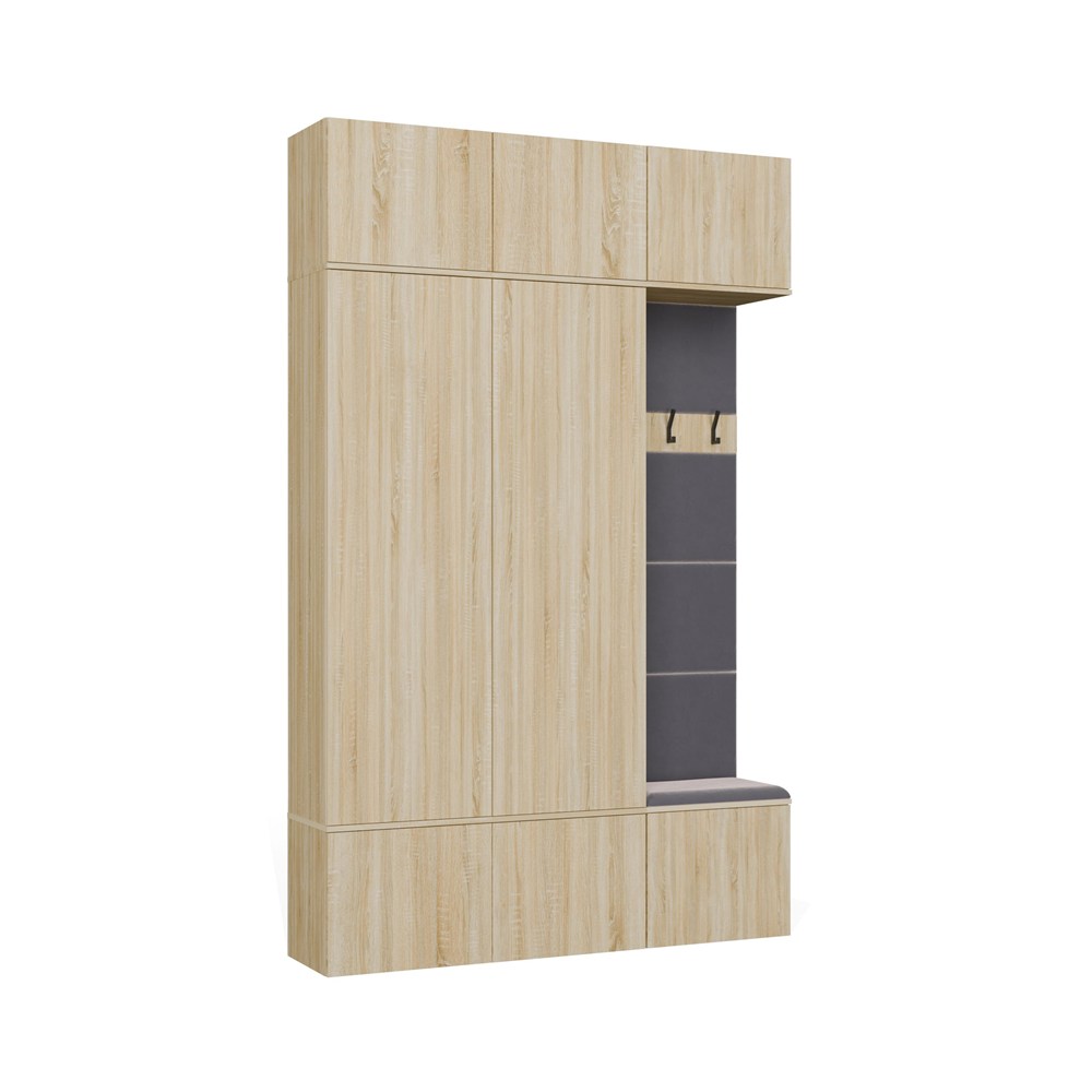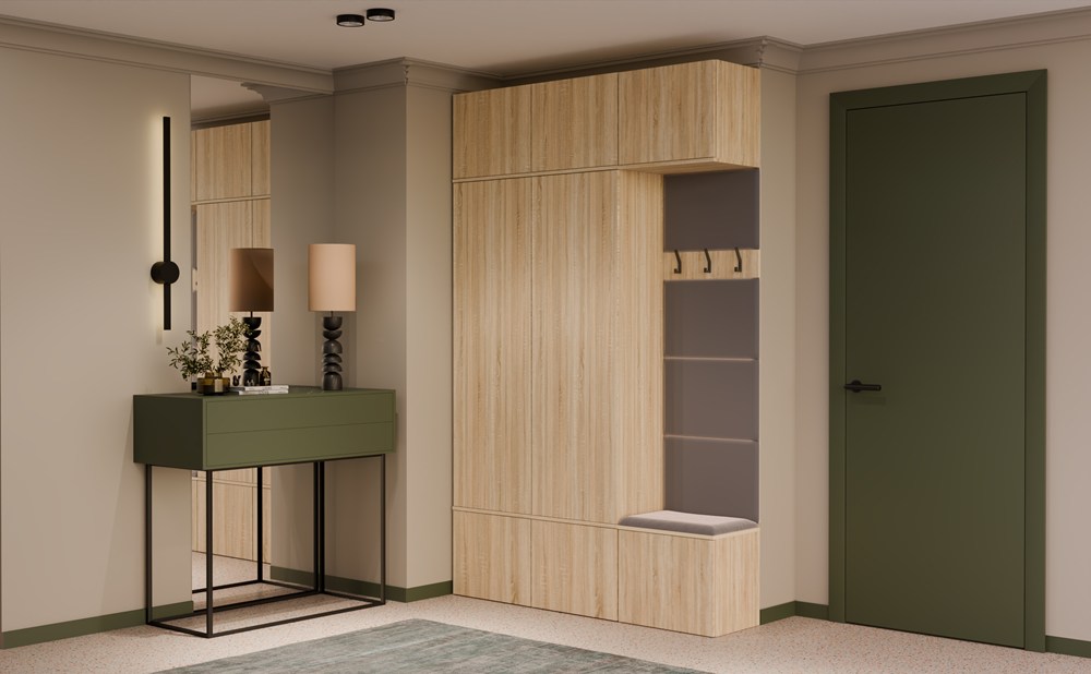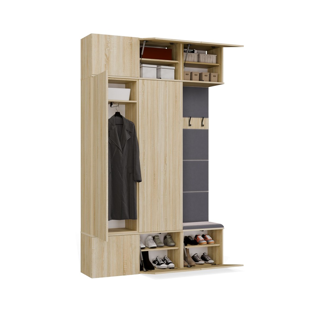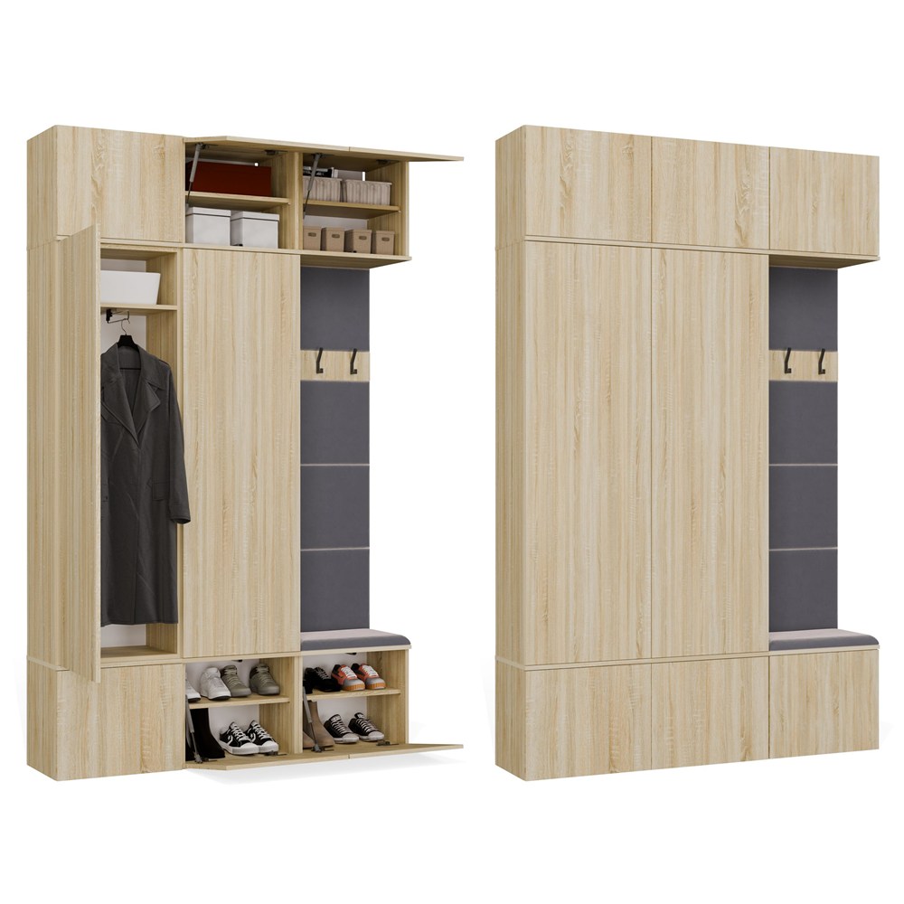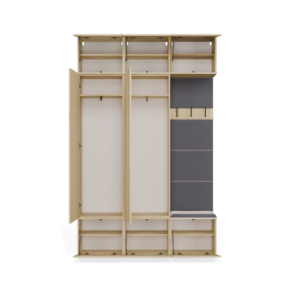 W skład zestawu wchodzą 2 pojemne szafy oraz moduł z wieszakiem, tapicerowanym siedziskiem i szafkami, dzięki czemu strefa wejściowa staje się uporządkowana, wygodna i funkcjonalna na co dzień.