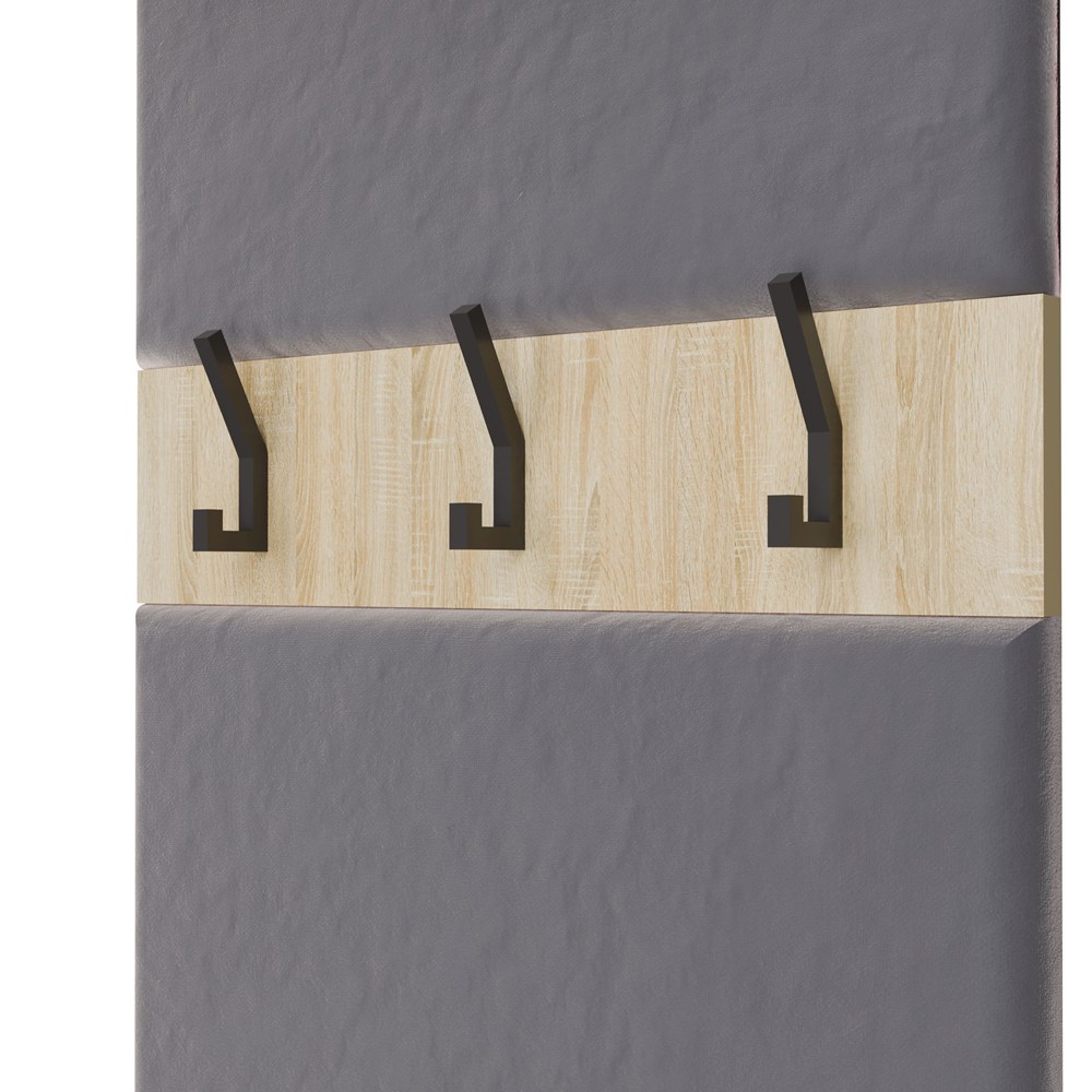 Moduł wieszaka HAGA 1W został wyposażony w 3 czarne haczyki, tapicerowany panel oparcia oraz wygodne siedzisko, które ułatwia zakładanie i zdejmowanie obuwia.