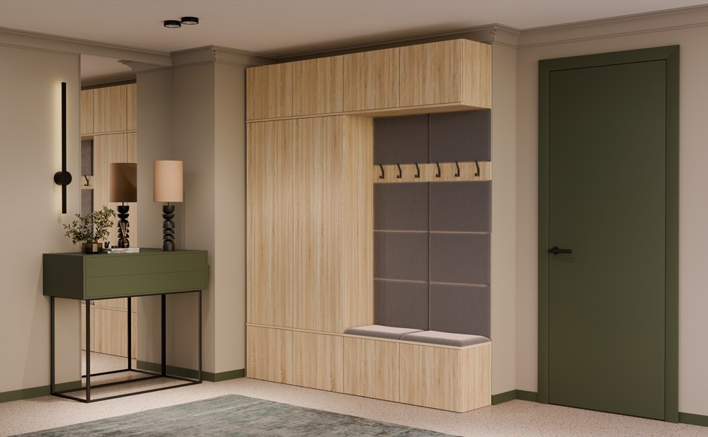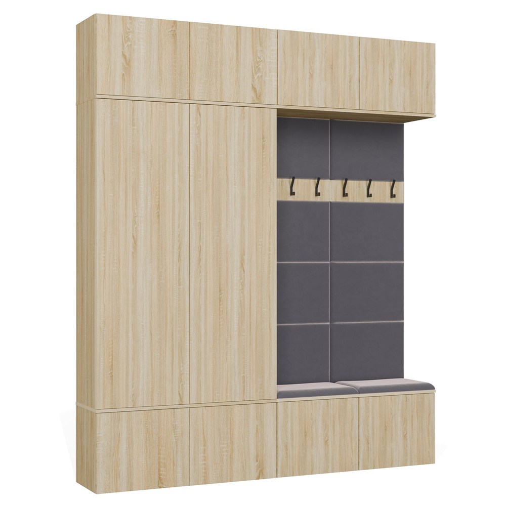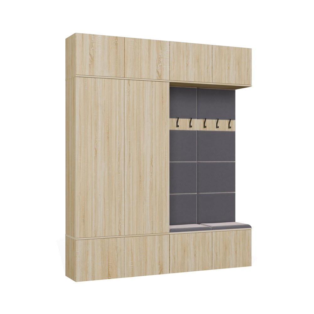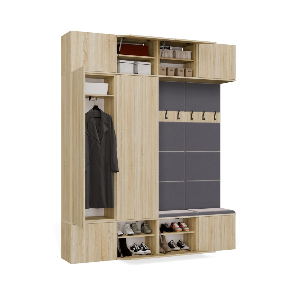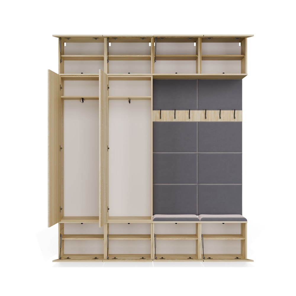 Komplet składa się z 2 szaf oraz 2 paneli z wieszakiem i siedziskiem, dzięki czemu tworzy gotową strefę wejściową do domu, mieszkania, korytarza lub holu.