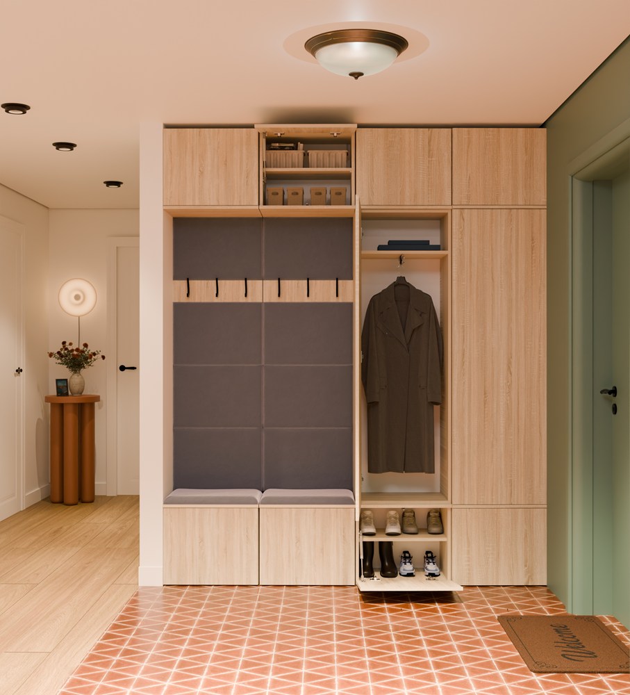 Moduły z tapicerowanym siedziskiem zapewniają komfort podczas zakładania obuwia, a czarne haczyki ułatwiają odwieszanie kurtek, toreb i dodatków codziennego użytku.