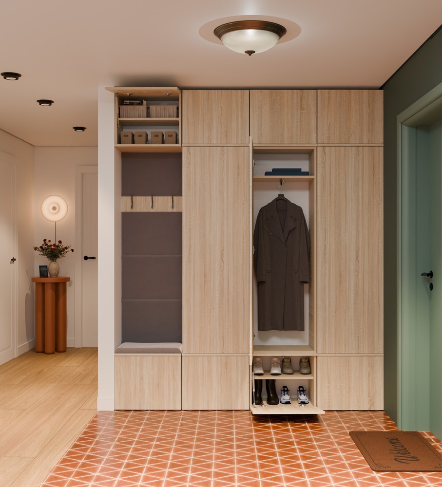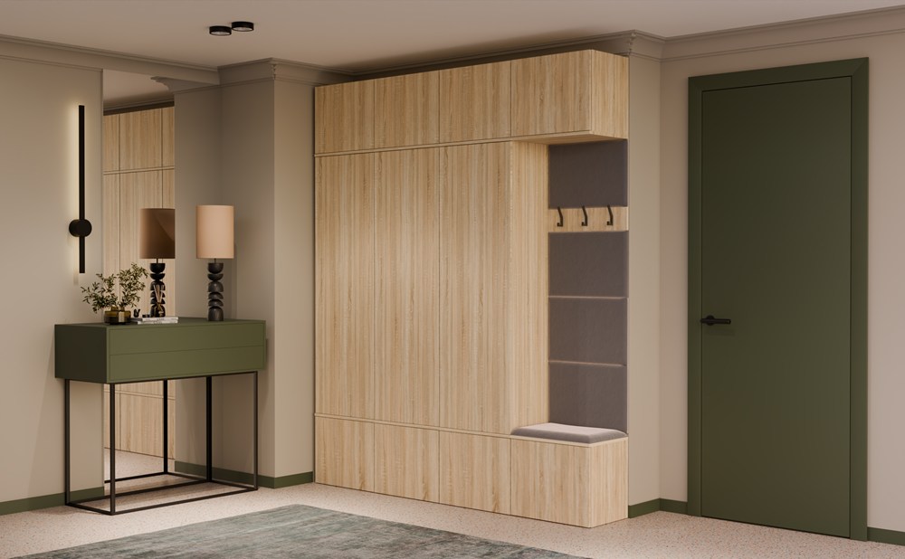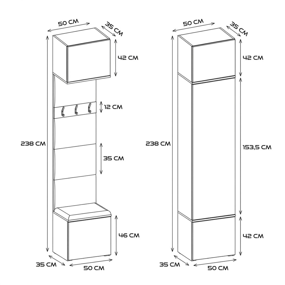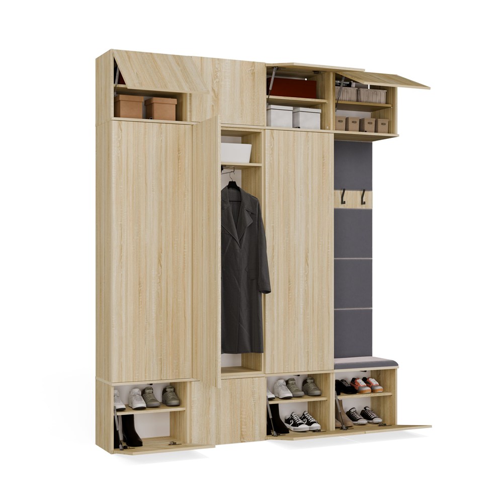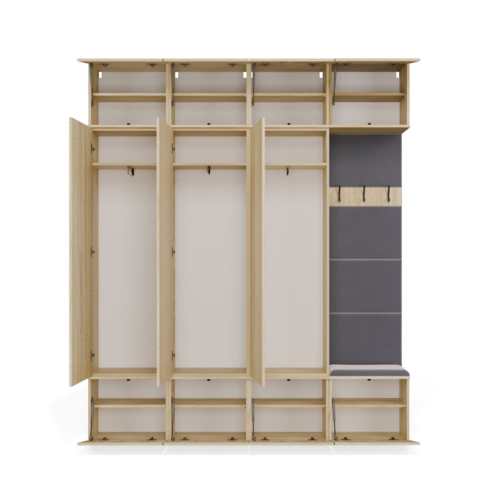 Zestaw łączy aż 3 pojemne szafy z modułem wieszaka, tapicerowanym siedziskiem i praktycznymi szafkami, dzięki czemu pomaga uporządkować odzież wierzchnią, obuwie oraz codzienne akcesoria.