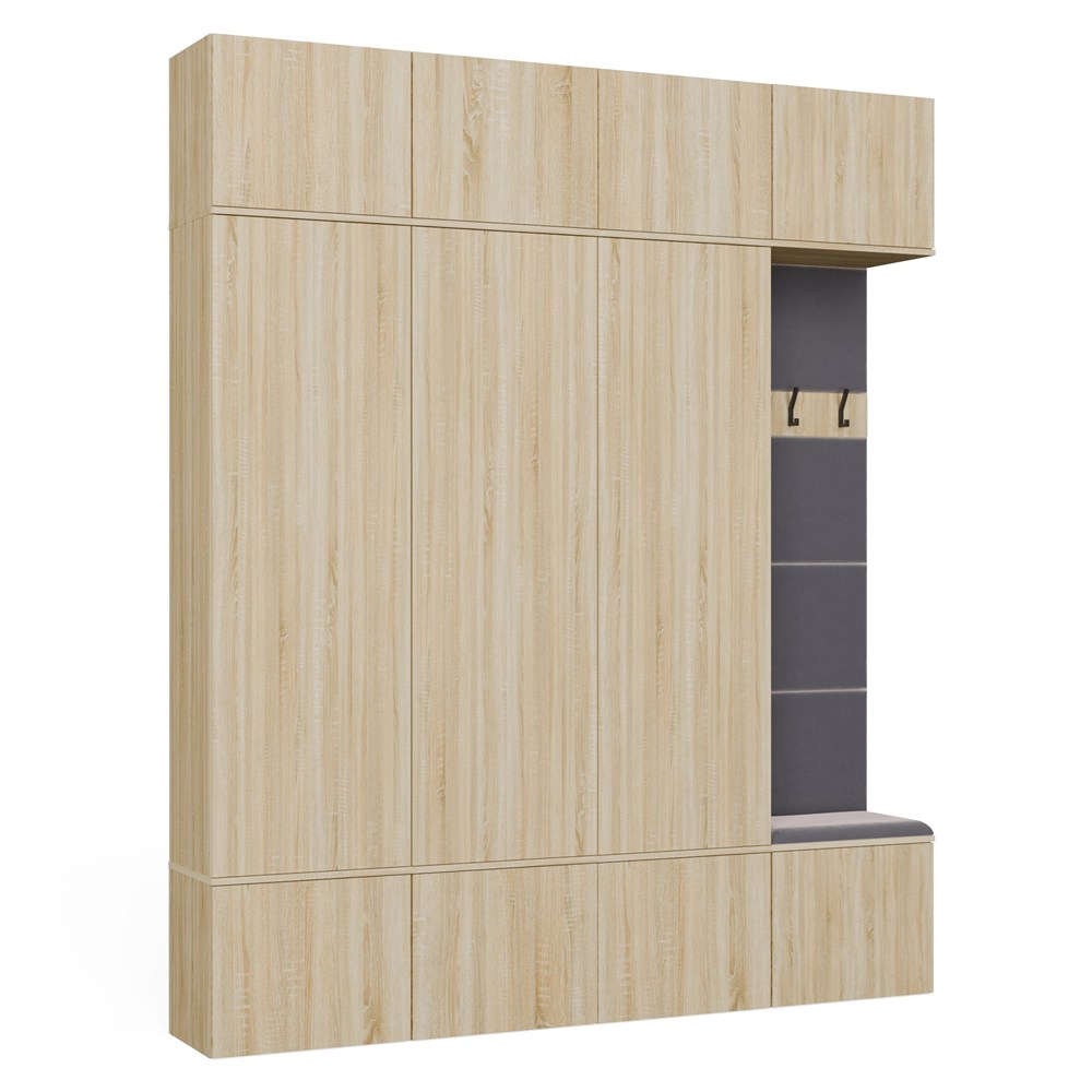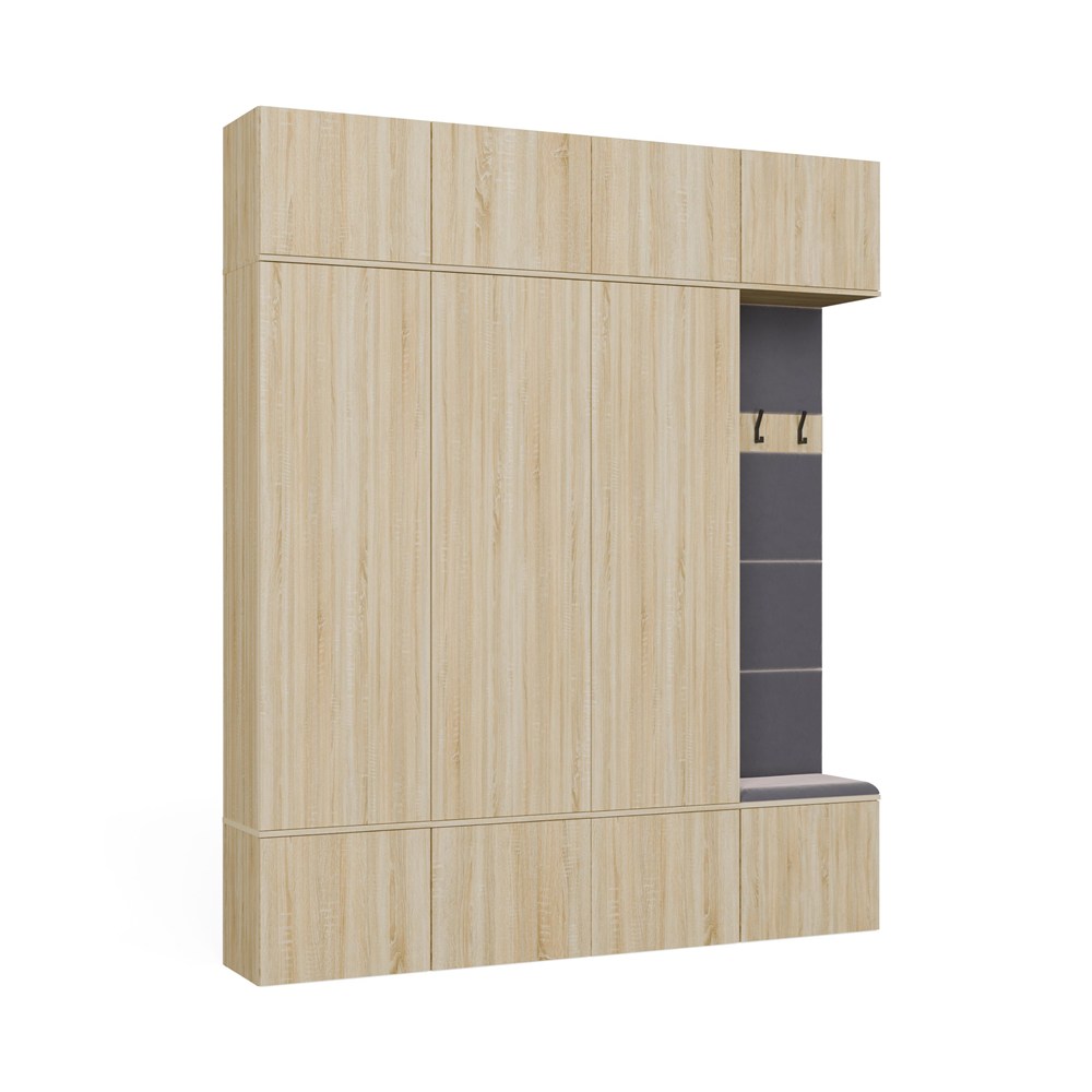 - Kompletny zestaw do przedpokoju – 3 szafy, wieszak, tapicerowane siedzisko, panel oparcia oraz szafki w jednym układzie