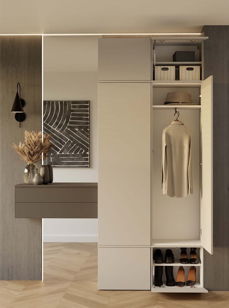 - Przemyślany układ – drążek na ubrania, półki, haczyki i miejsce na buty