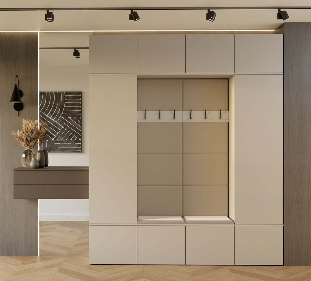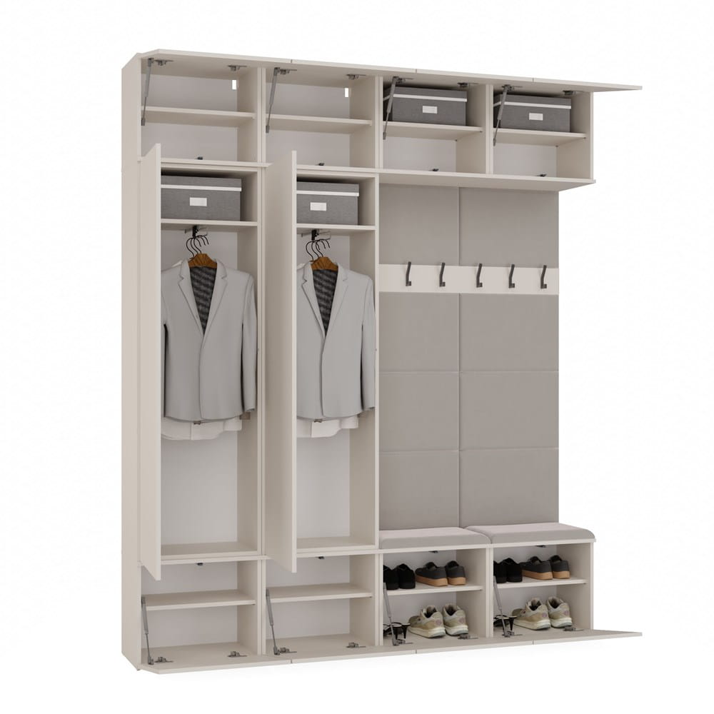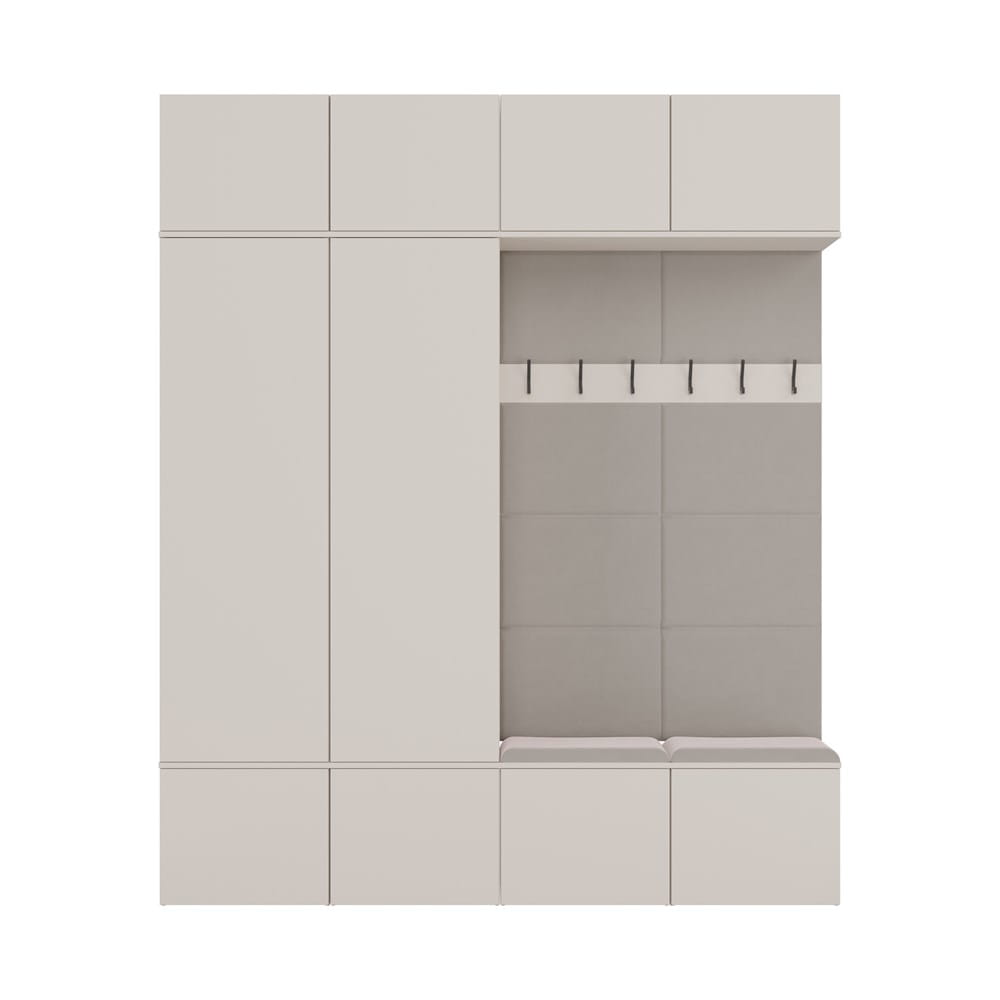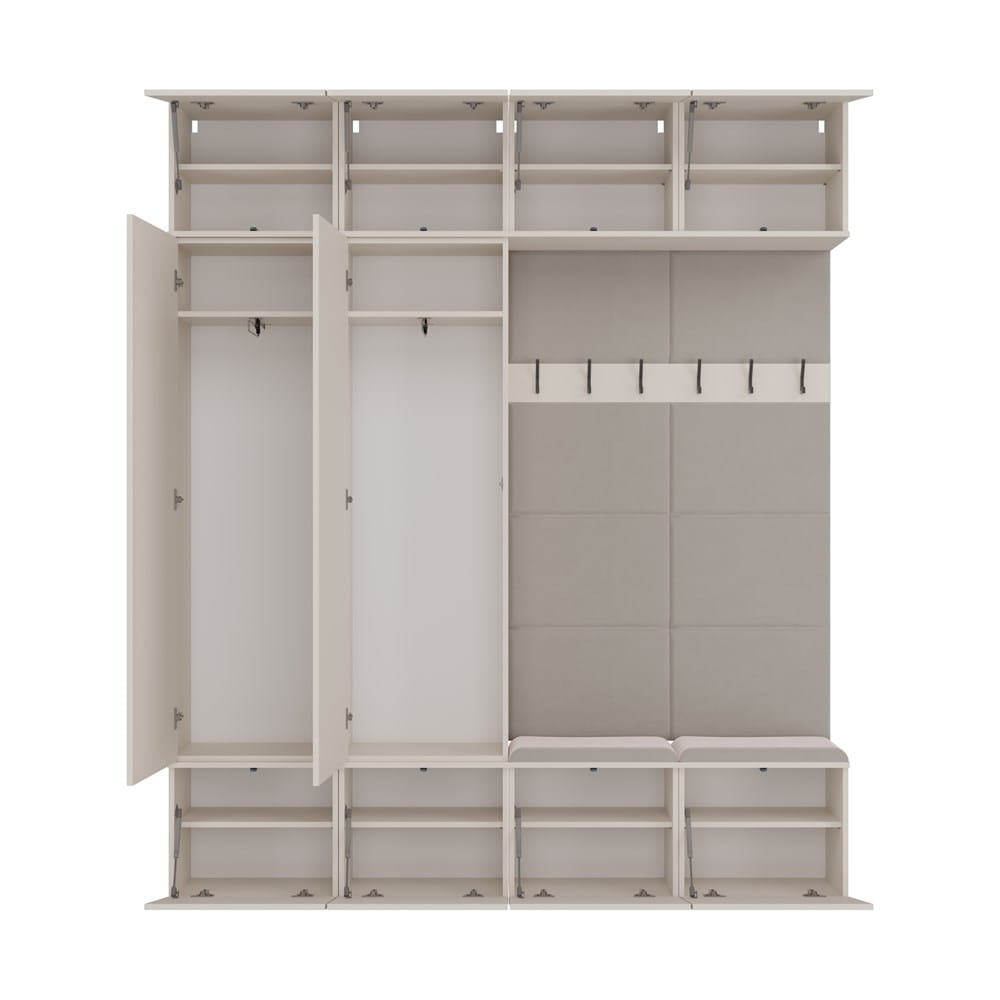 Każda z dwóch szaf oferuje wydzielone półki i drążek na ubrania, natomiast moduły z siedziskiem wyposażone są w haczyki na odzież wierzchnią, wygodne siedziska i dodatkowe szafki. Bezuchwytowy system TIP-ON zapewnia nowoczesne, minimalistyczne wykończenie, a neutralny kolor kaszmir dodaje aranżacji elegancji i ciepła.