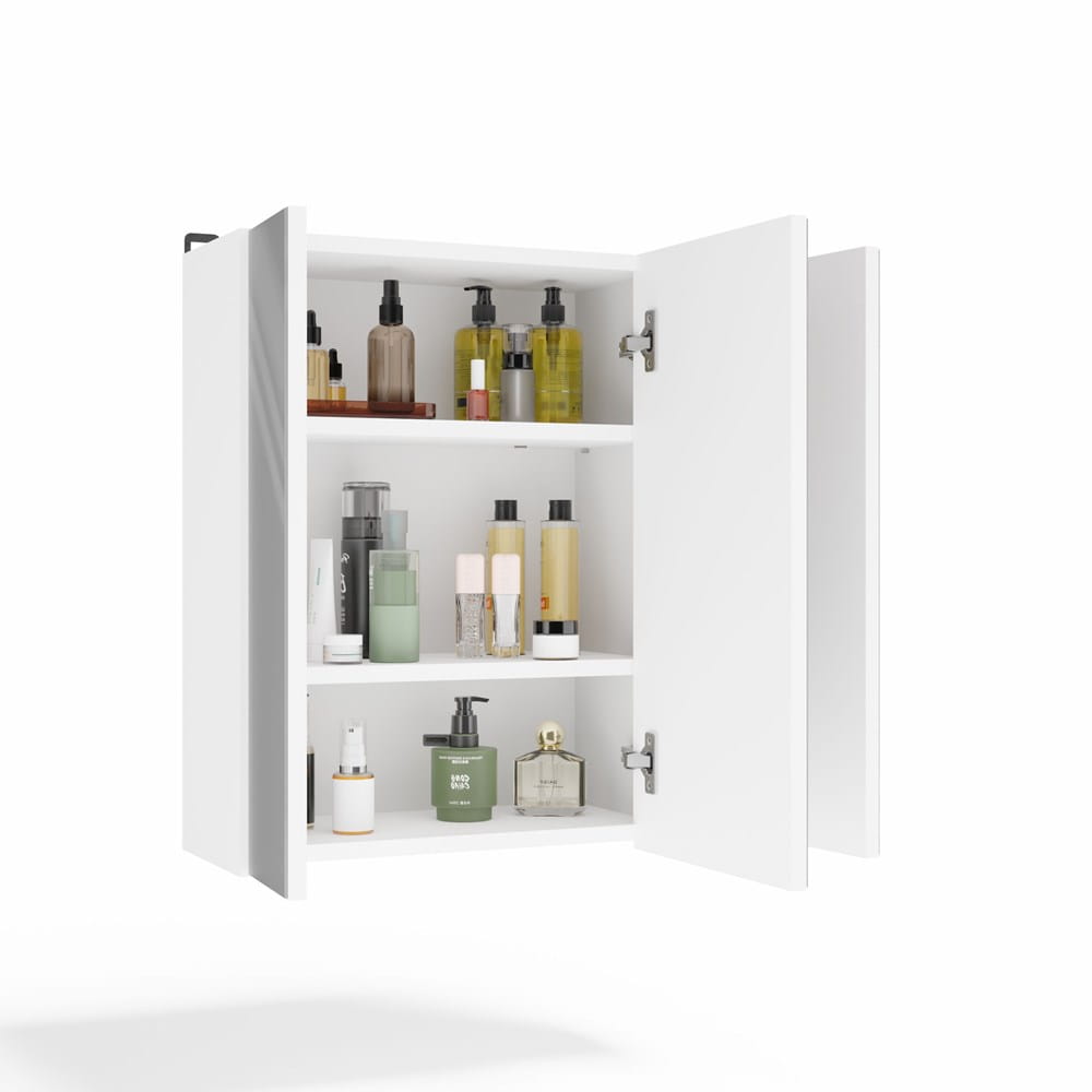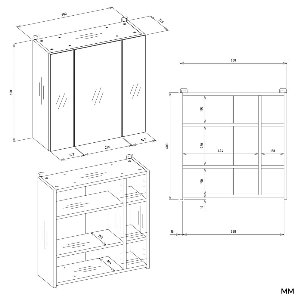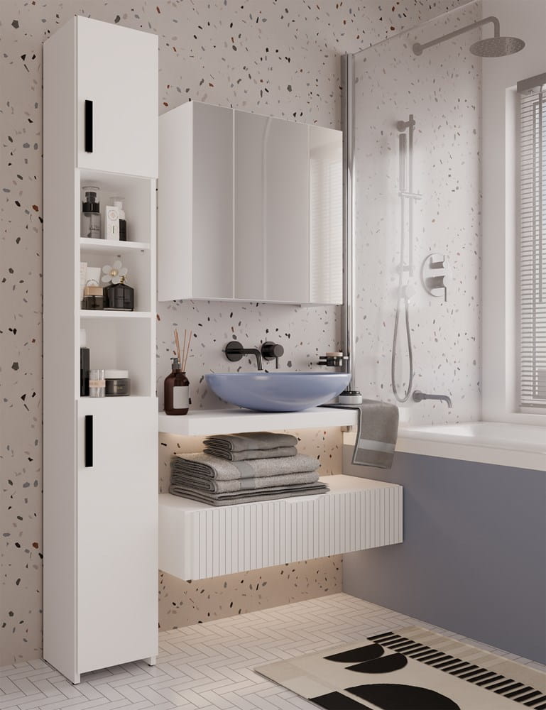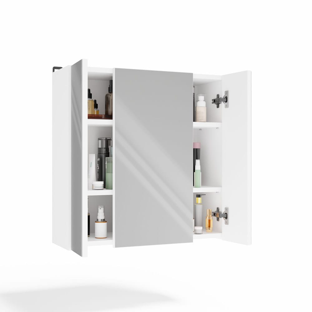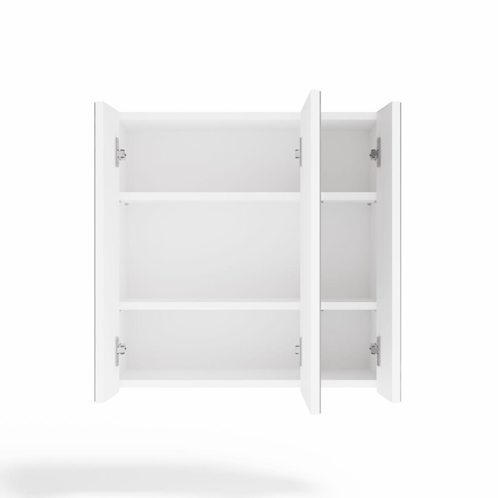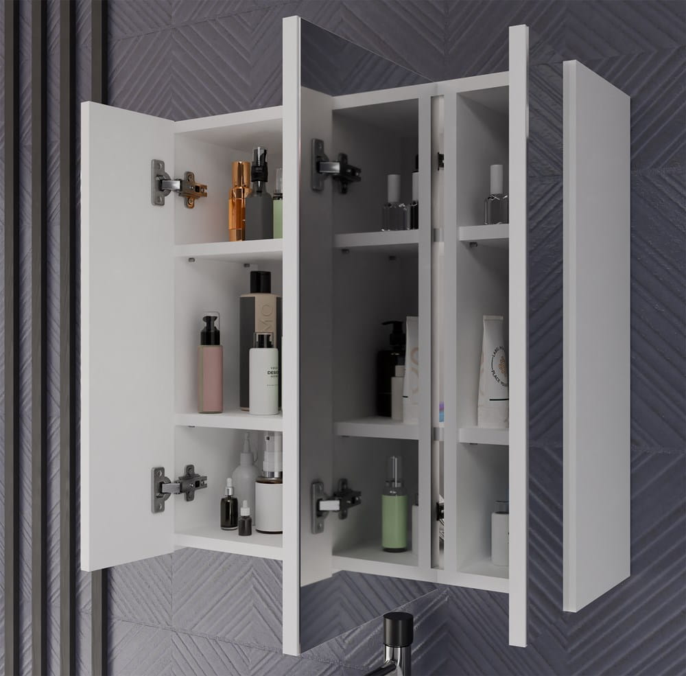 Wyposażona w trzy drzwiczki z lustrami oraz sześć pojemnych półek, zapewnia doskonałe miejsce do przechowywania kosmetyków, ręczników, środków czystości oraz innych akcesoriów łazienkowych. Gładkie boki i minimalistyczna konstrukcja gwarantują estetyczny wygląd, a nowoczesne okucia podkreślają elegancki charakter mebla.