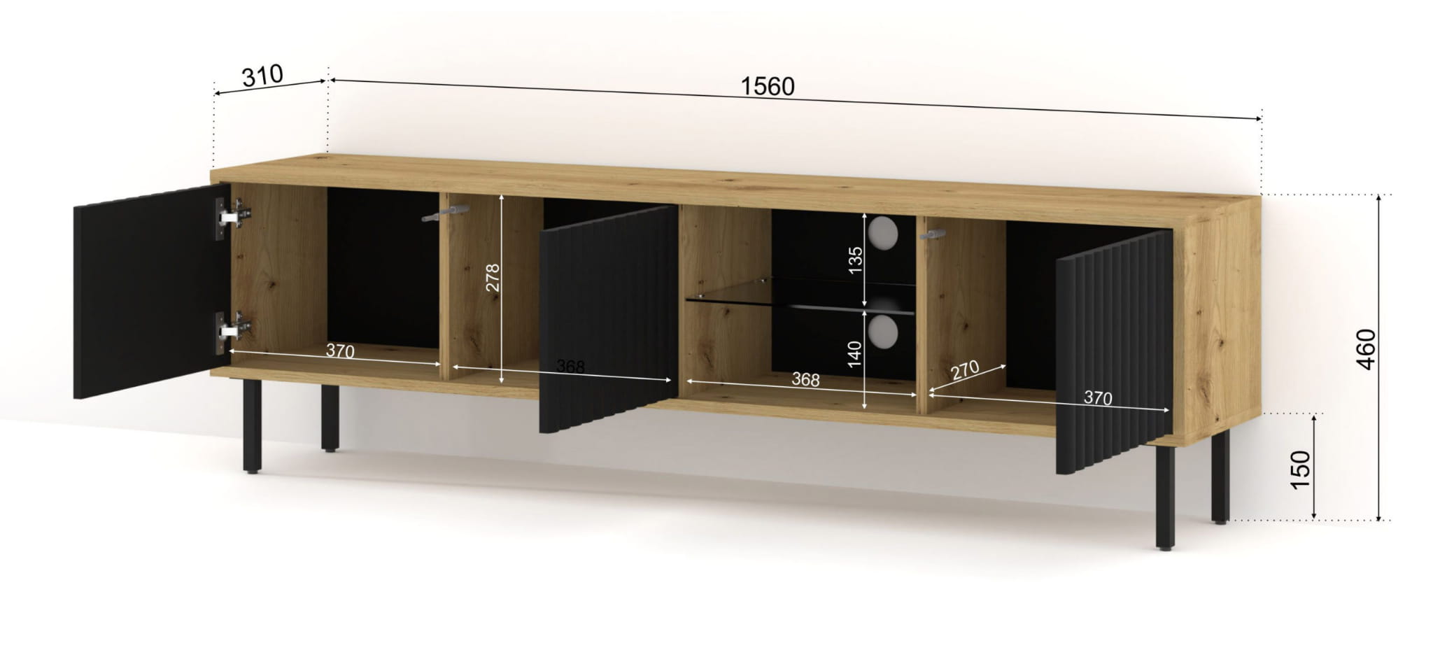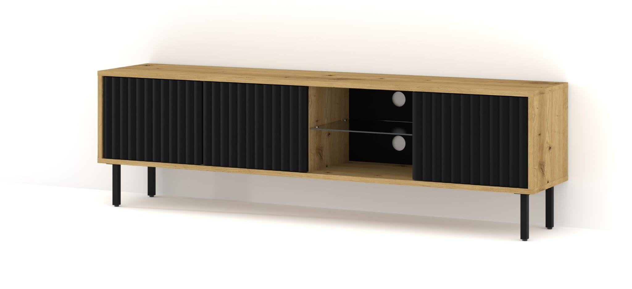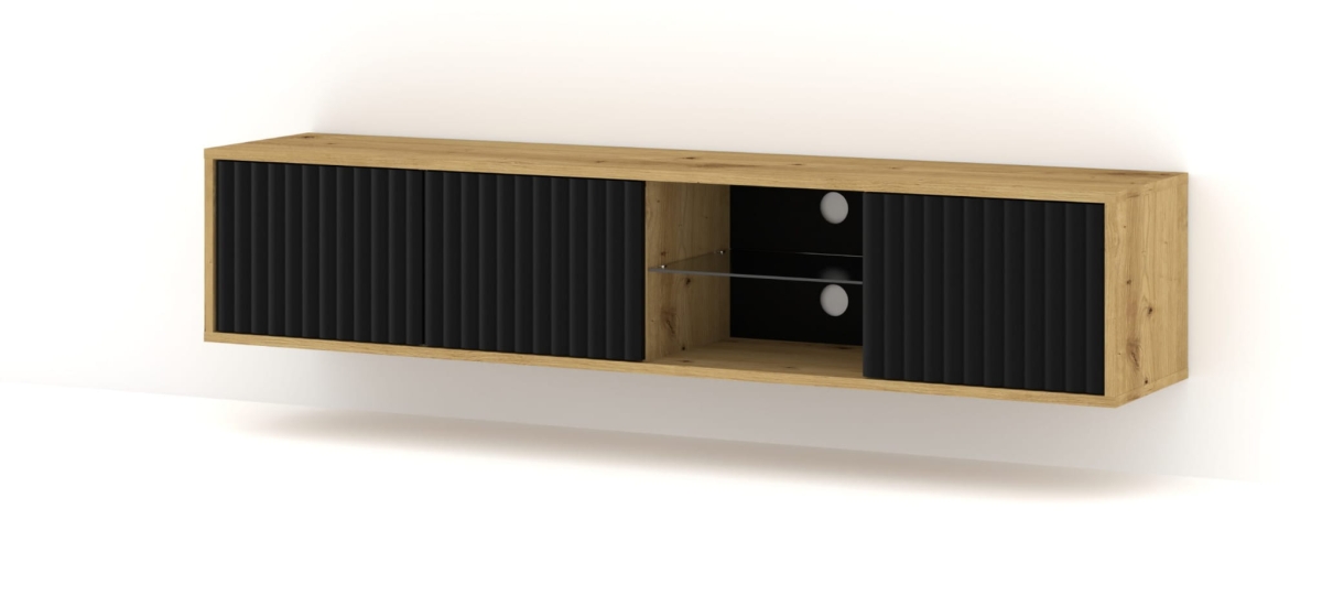 Wyposażona w trzy drzwi oraz otwartą komorę z półką wykonaną z hartowanego szkła, oferuje mnóstwo miejsca na przechowywanie urządzeń RTV, jednocześnie pozwalając na wyeksponowanie ulubionych dekoracji czy akcesoriów.