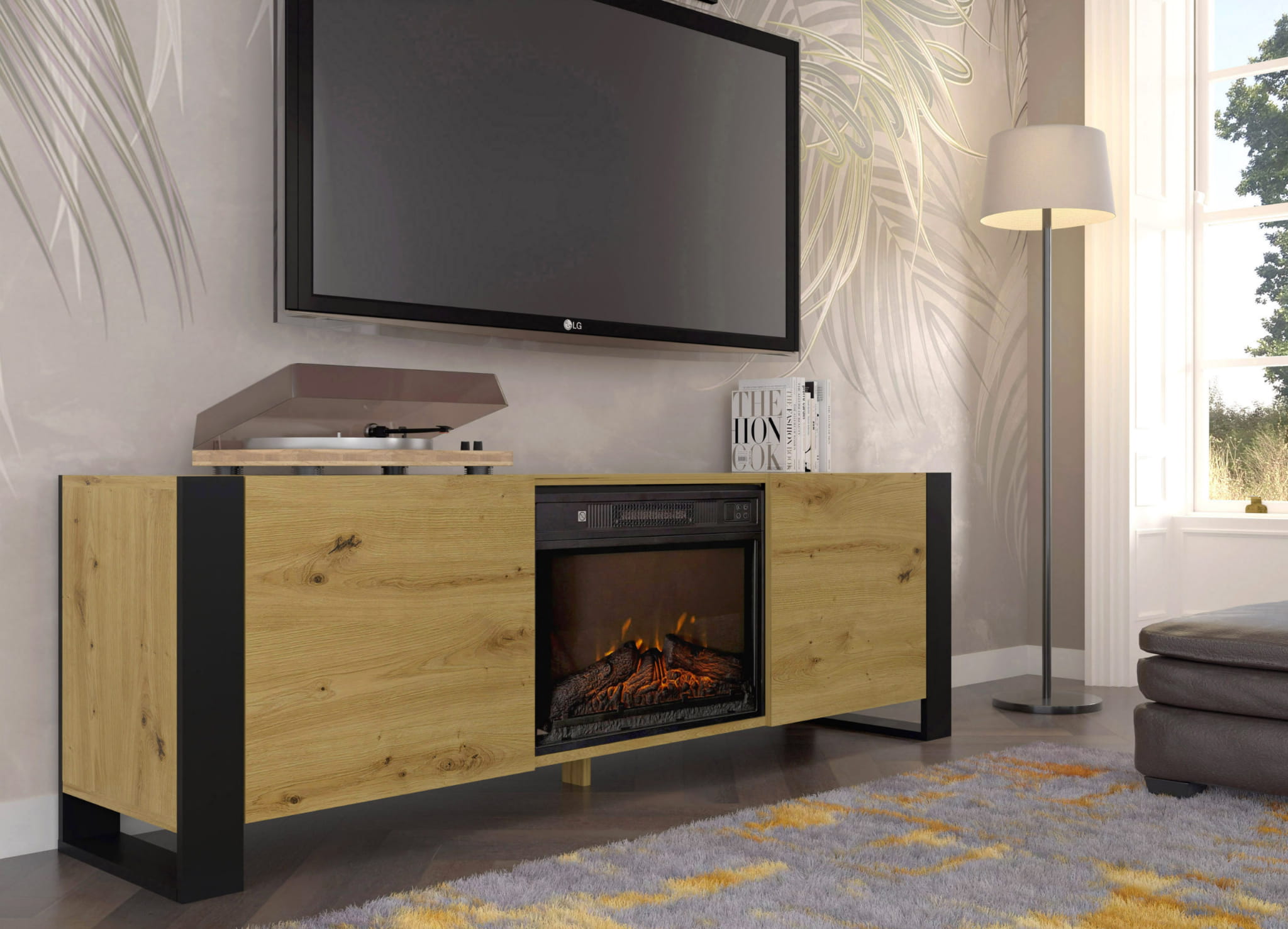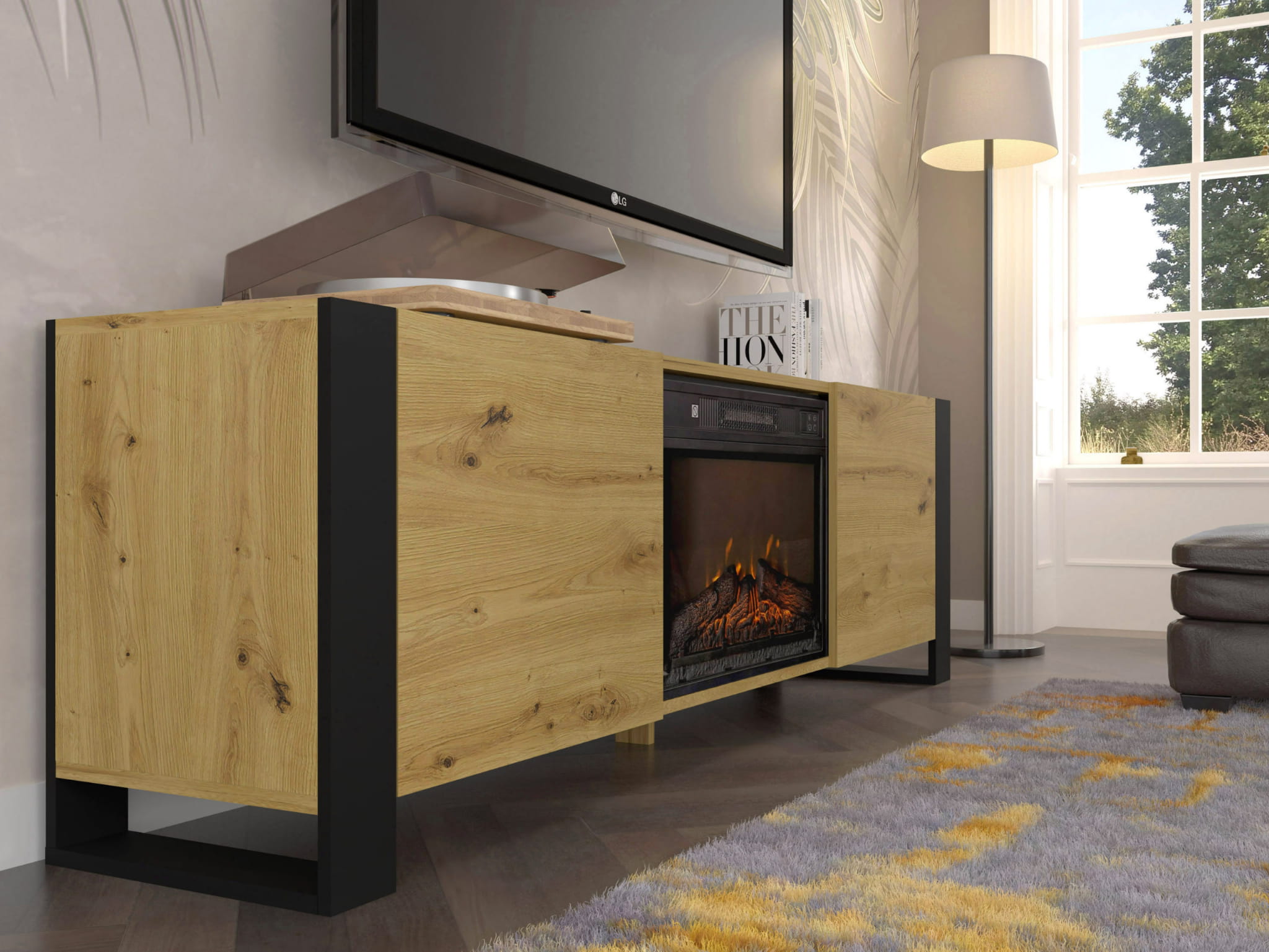 Szafka RTV Mondi to połączenie nowoczesnego designu, funkcjonalności i przytulnego klimatu, jakie zapewnia wbudowany kominek elektryczny.
