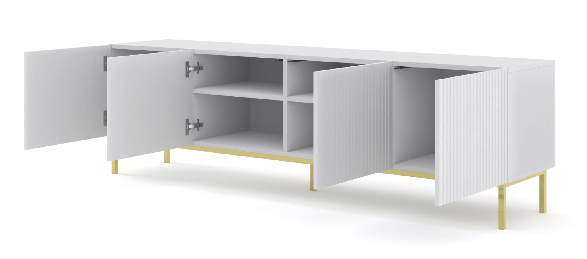 Szafka RTV czterodrzwiowa z frezowanymi frontami, metalowa rama, system push to open
