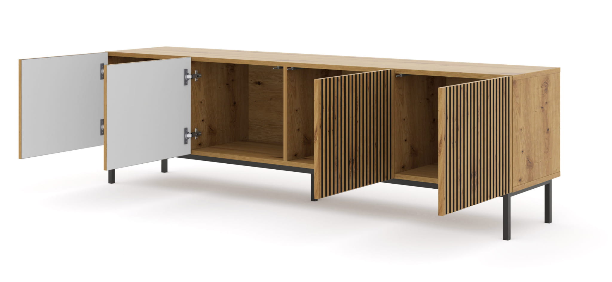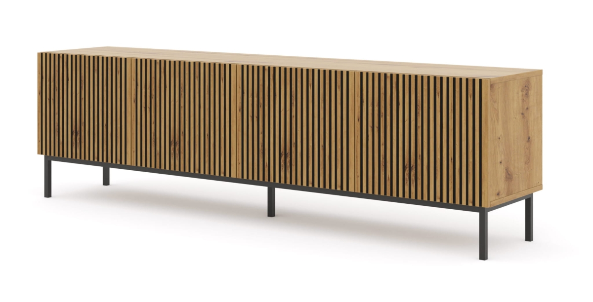 Szafka RTV 200 cm, dąb artisan na czarnych nogach, z frezowanym frontem Ravenna F 4D
