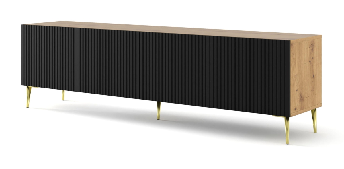 Szafka RTV 200 cm, na złotych szpilkach do salonu, czarna matowa/dąb artisan Ravenna B to funkcjonalny i estetyczny wybór, który sprawdzi się w różnych wnętrzach. Wyróżnia się solidnym wykonaniem i ponadczasowym charakterem. Będzie idealnym dodatkiem do Twojej przestrzeni.