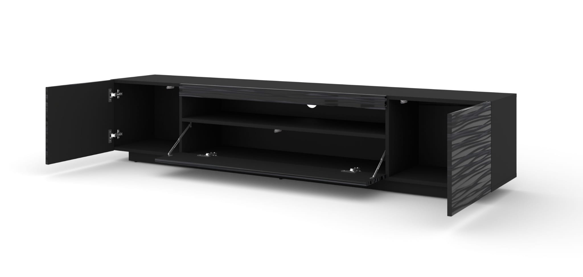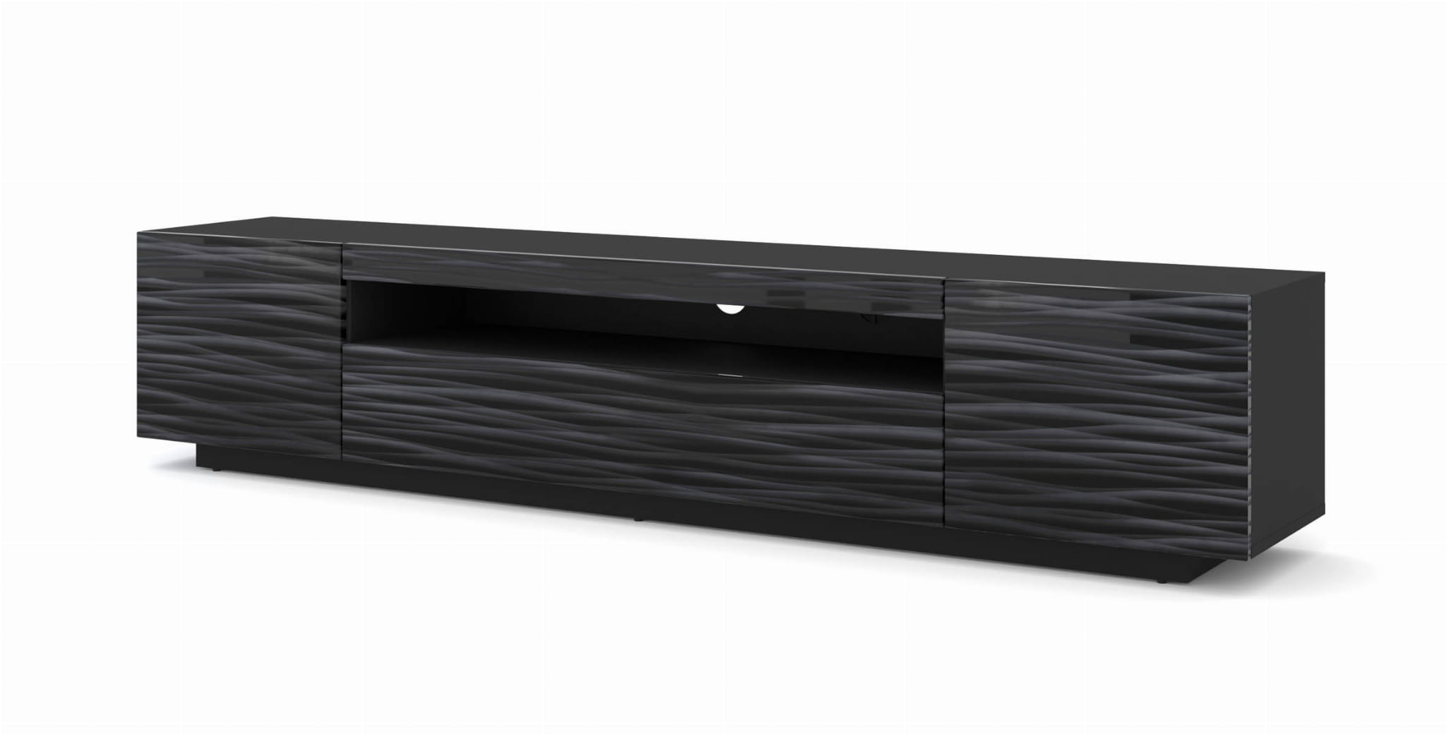 Szafka RTV Aura 200 cm w kolorze czarna Sahara to nowoczesna propozycja do salonu, strefy multimedialnej lub eleganckiego pokoju dziennego.