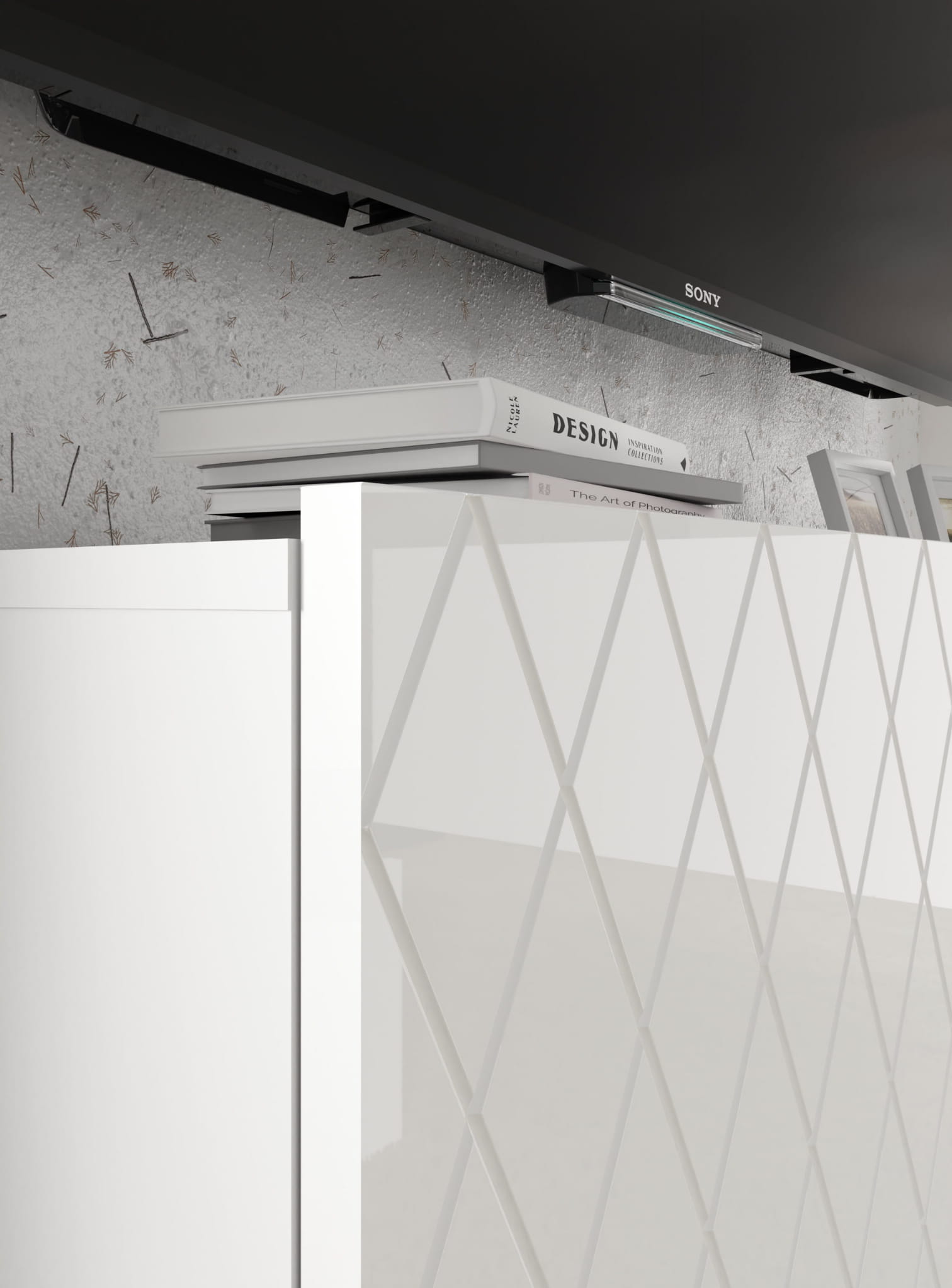 Szafka RTV Diuna to luksusowy mebel z eleganckiej kolekcji dedykowanej nowoczesnym salonom. Efektowne frezowane fronty w wysokim połysku dodają wnętrzu klasy, a wizualna lekkość bryły sprawia, że mebel doskonale komponuje się w różnych aranżacjach.