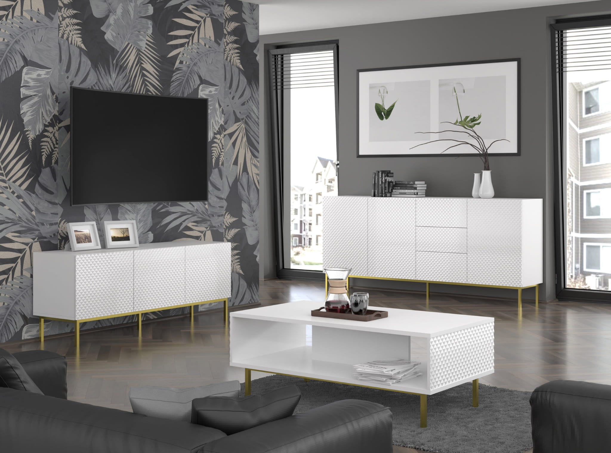 Szafka RTV Ravenna to propozycja dla miłośników nowoczesnego designu i elegancji. Stanowi część wyjątkowej kolekcji Ravenna, stworzonej z myślą o aranżacjach salonu, jadalni i sypialni. Jej frezowane fronty w diamentowy wzór oraz wykończenie w połysku podkreślają luksusowy charakter mebla, wprowadzając do wnętrza harmonię i wyrafinowany styl.