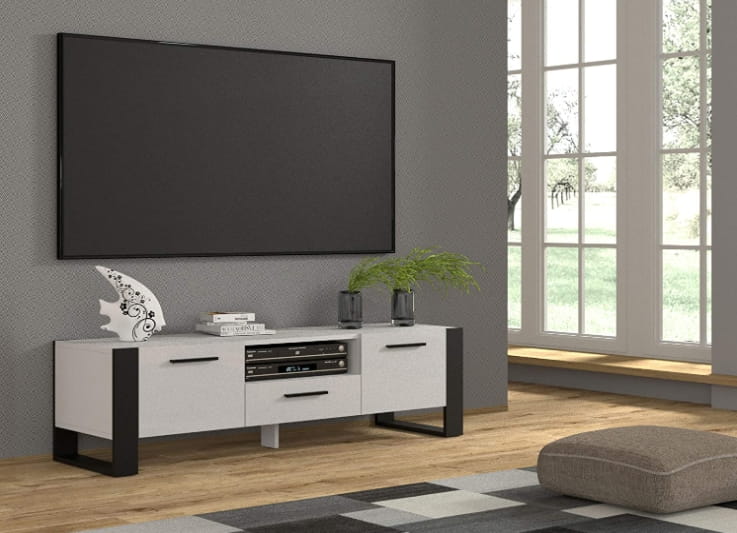 Trzy zamknięte półki: Dwie boczne oraz jedna środkowa półka, idealne do przechowywania sprzętu RTV, akcesoriów czy innych przedmiotów.