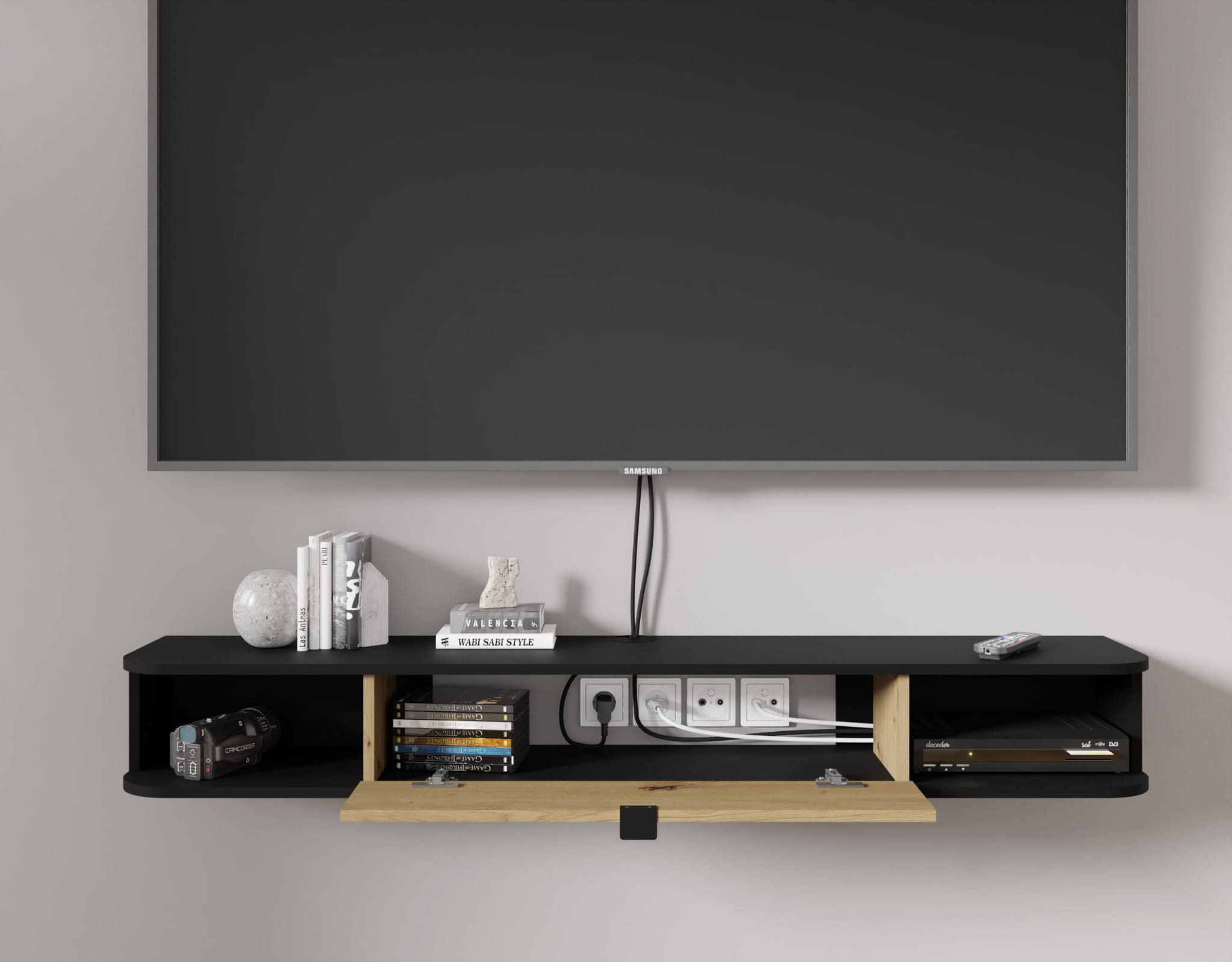 Szafka RTV wisząca 156 cm, do salonu czarna matowa/dąb artisan Icarus