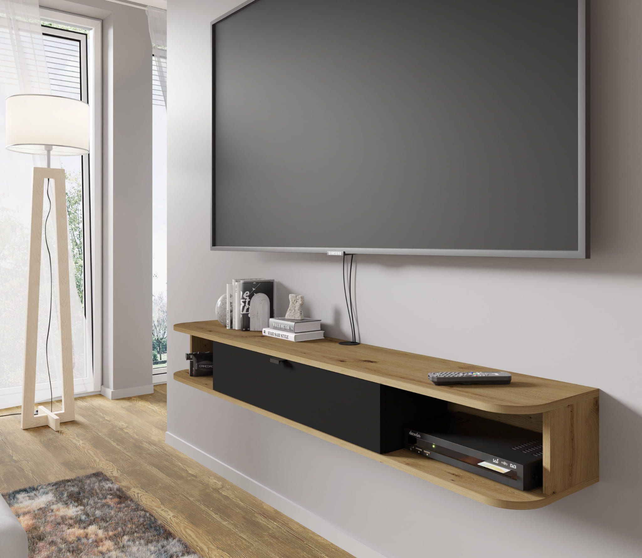Minimalistyczny wygląd tej szafki pod telewizor nie oznacza braku praktyczności – wręcz przeciwnie, ICARUS to mebel, który dzięki swojej konstrukcji zyskuje na funkcjonalności i ergonomicznym wykorzystaniu przestrzeni.