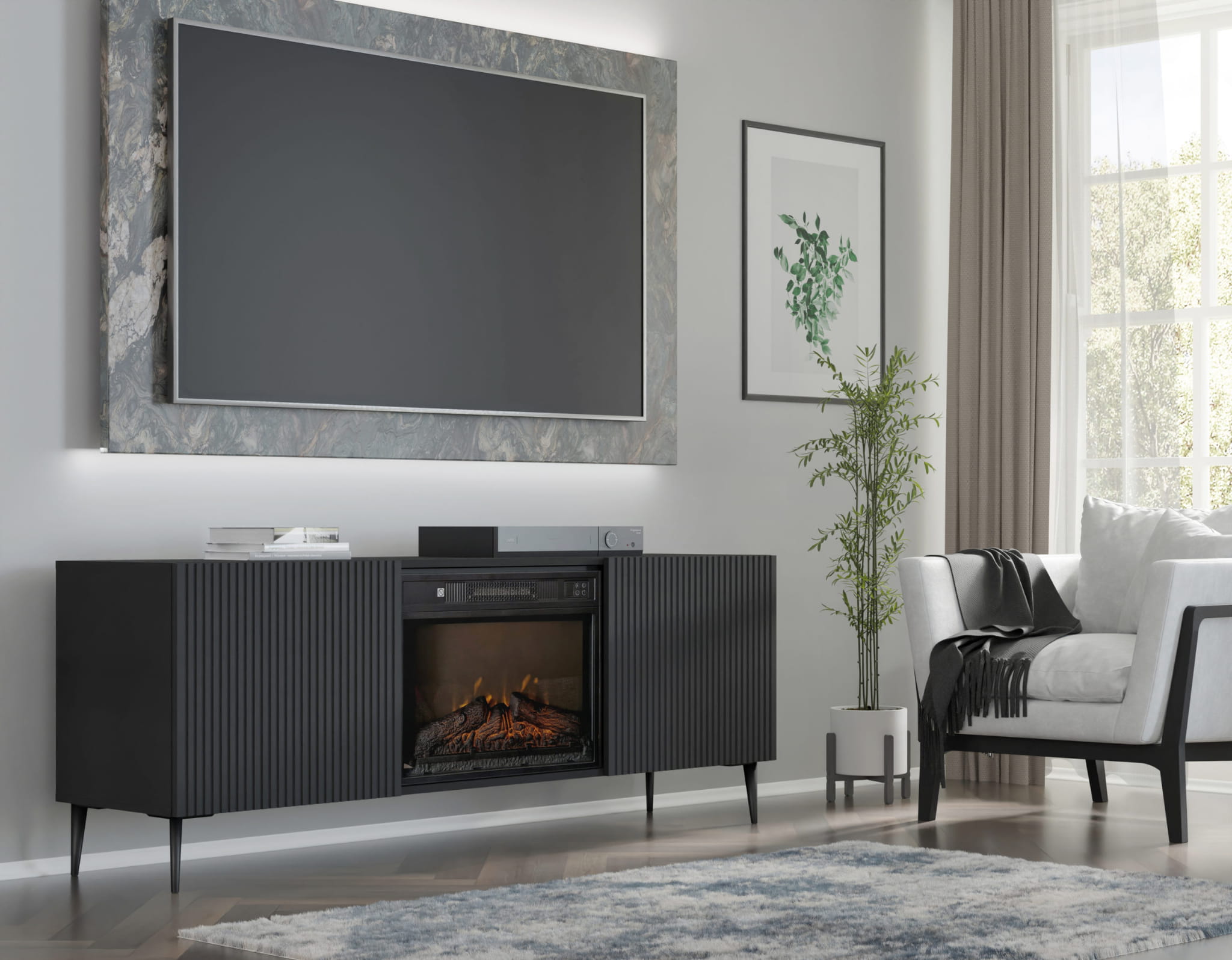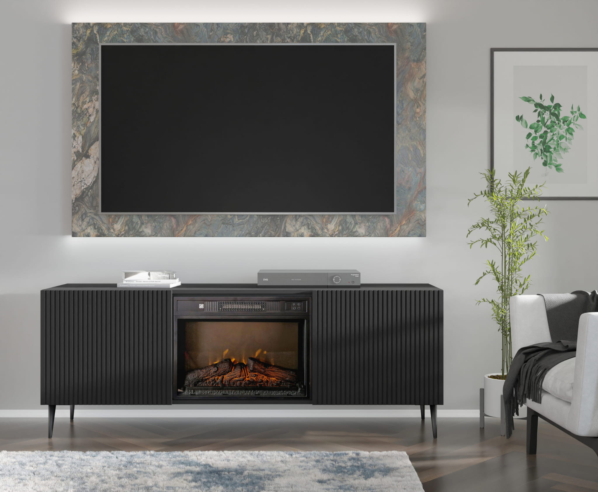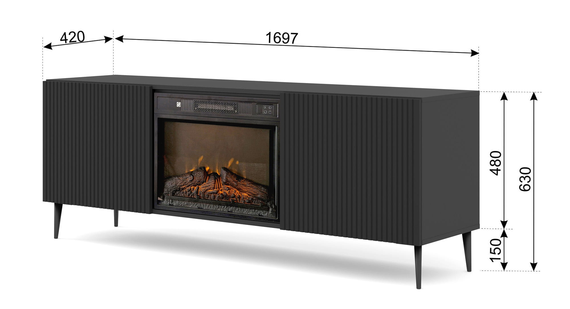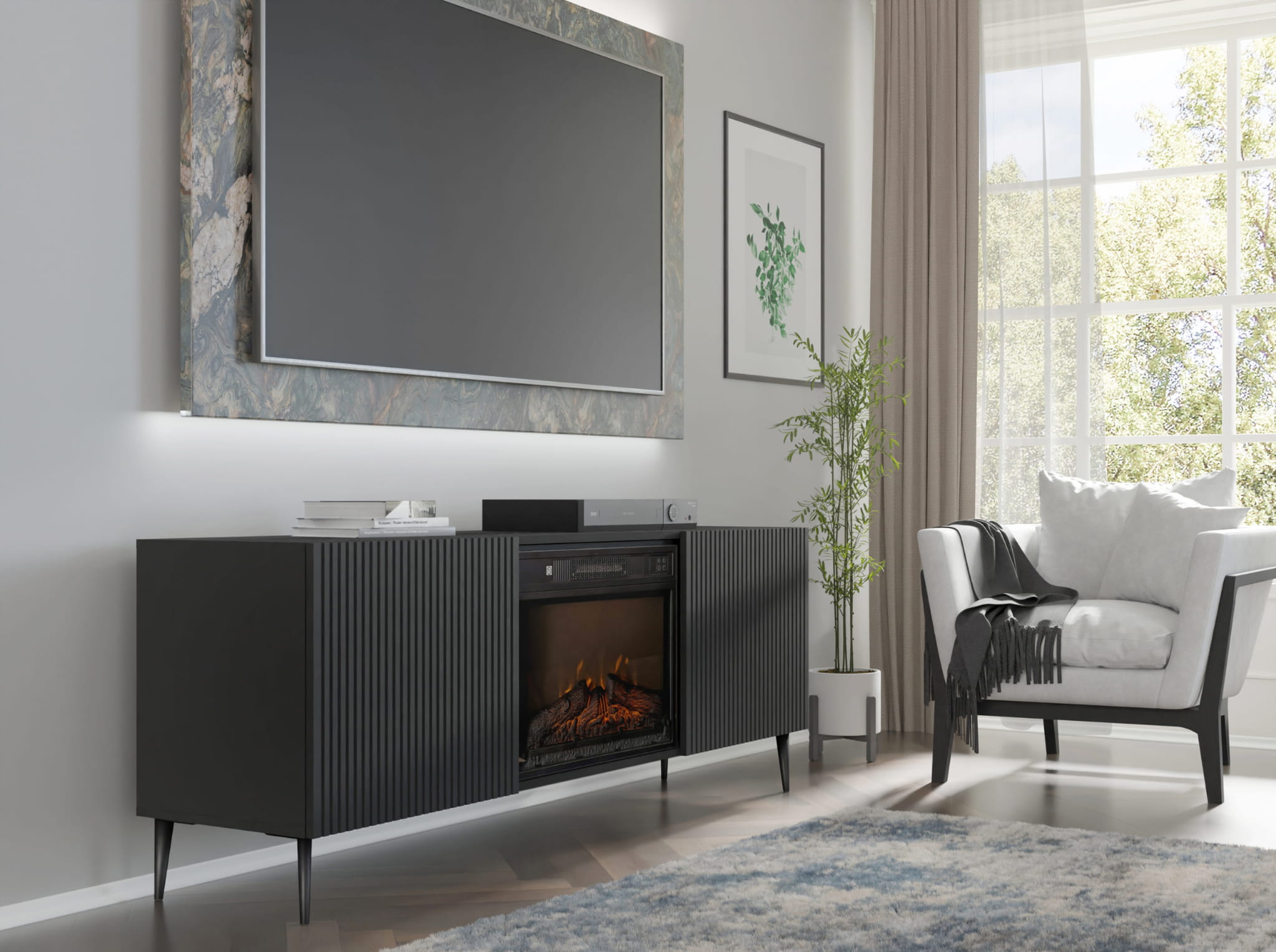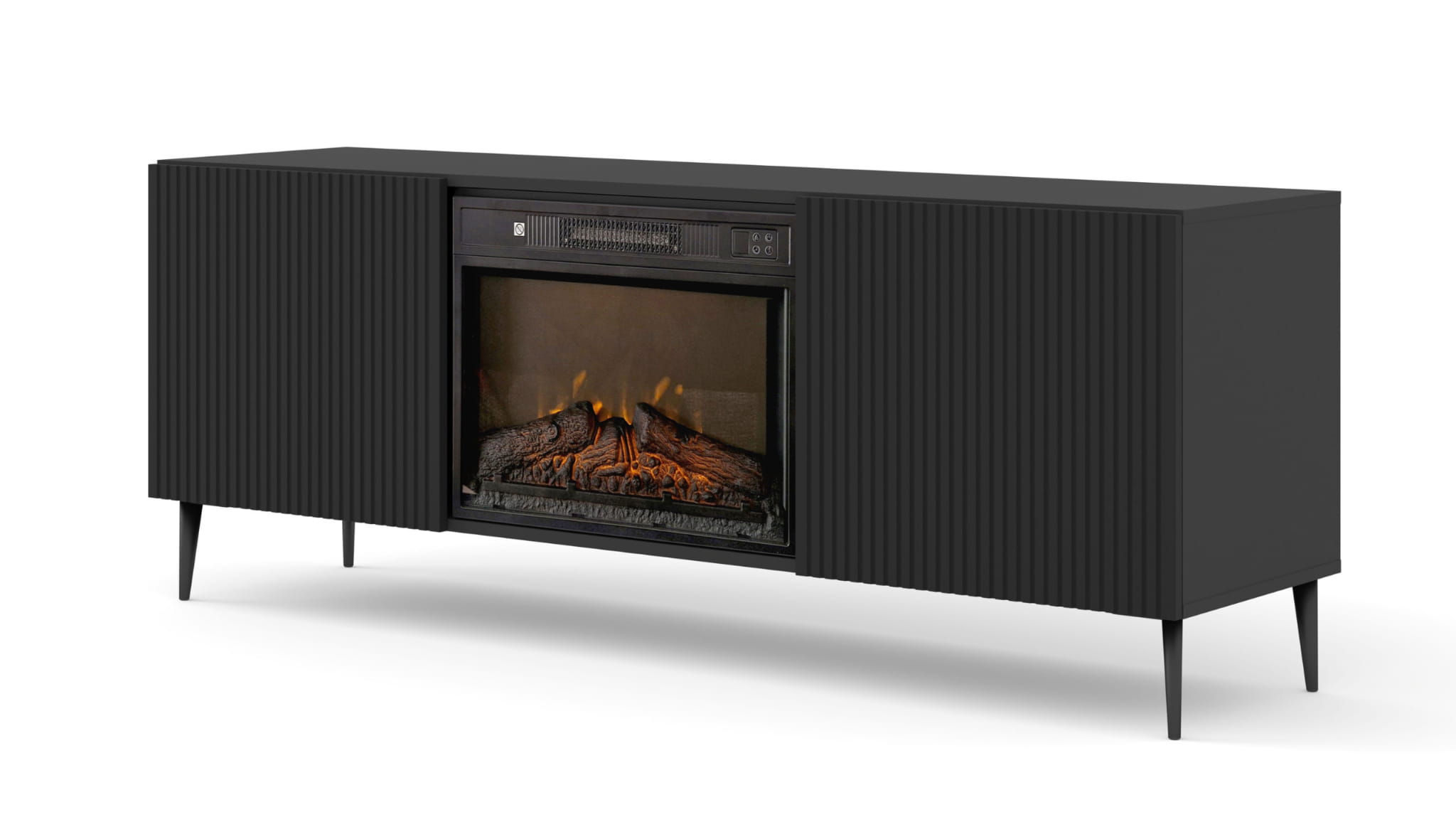 Szafka RTV z kominkiem elektrycznym, 170 cm czarna do salonu, 2D Ravenna F