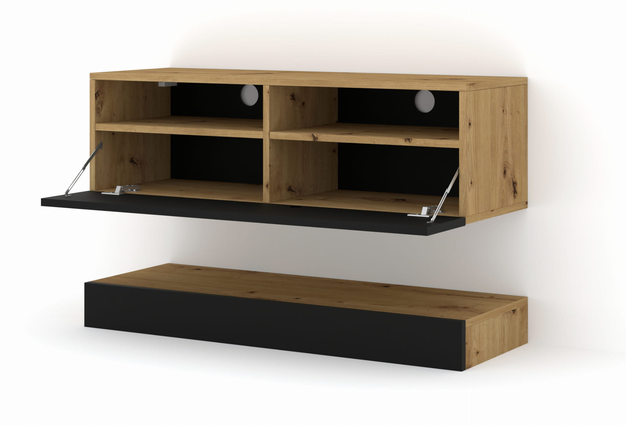 Dwupoziomowa konstrukcja: Składa się z wiszącej części z dwoma zamykanymi schowkami oraz dolnego panelu leżącego.