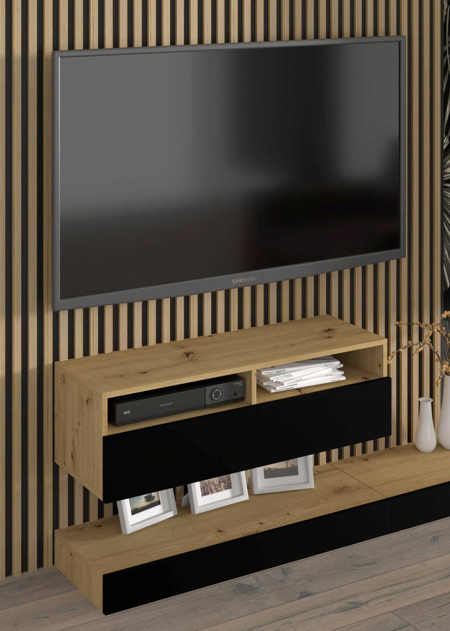 Nowoczesny design: Prosta forma w modnej kolorystyce – naturalny dąb artisan w połączeniu z matową czernią – doda elegancji każdemu wnętrzu.