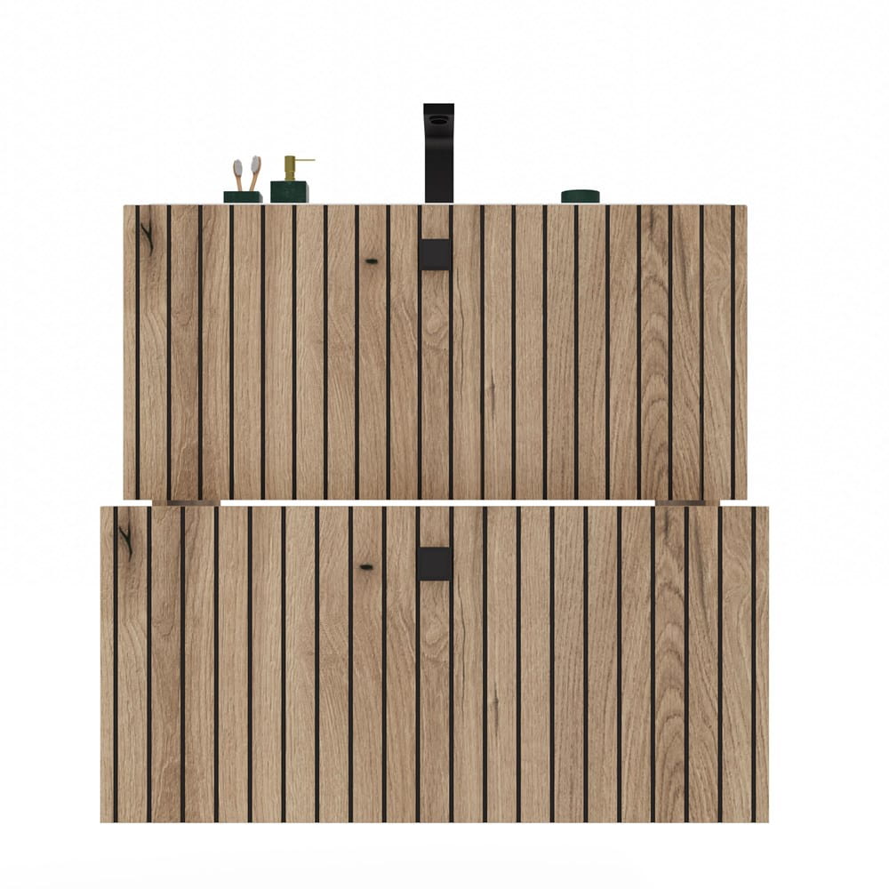 Dzięki dwóm pojemnym szufladom z wycięciem na syfon, szafka umożliwia wygodne przechowywanie kosmetyków, środków czystości oraz innych niezbędnych akcesoriów łazienkowych. Metalowe uchwyty w czarnym macie dodają elegancji, a wisząca konstrukcja ułatwia utrzymanie porządku.