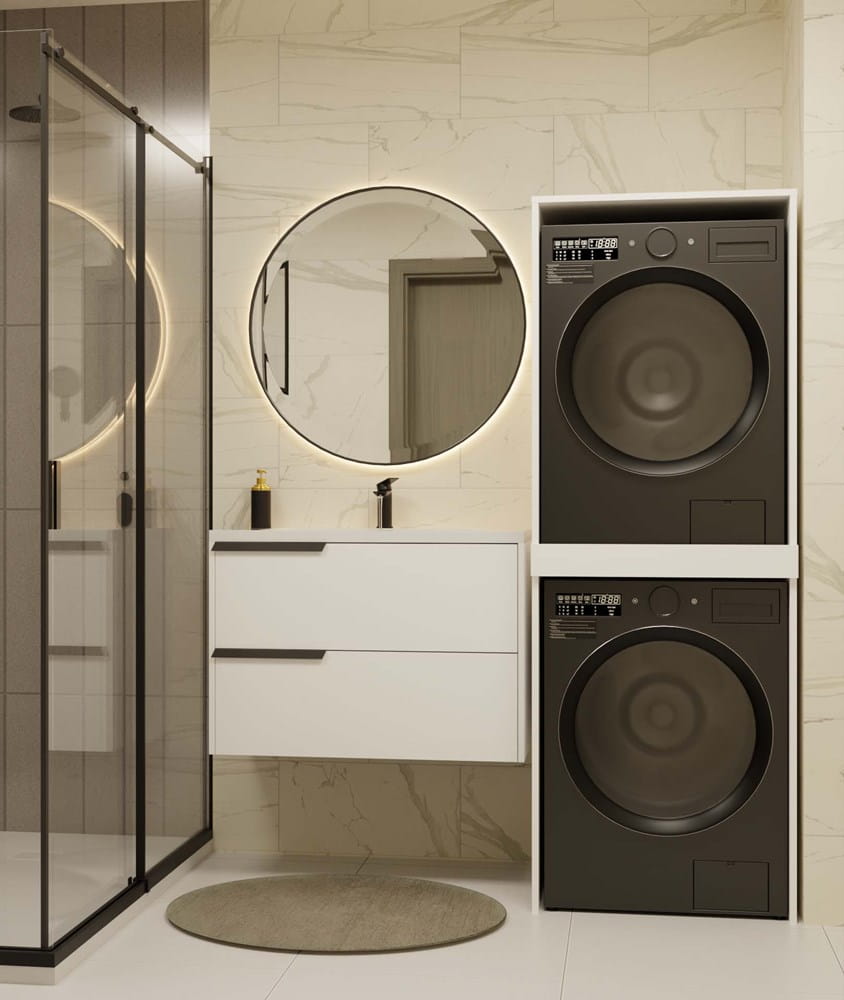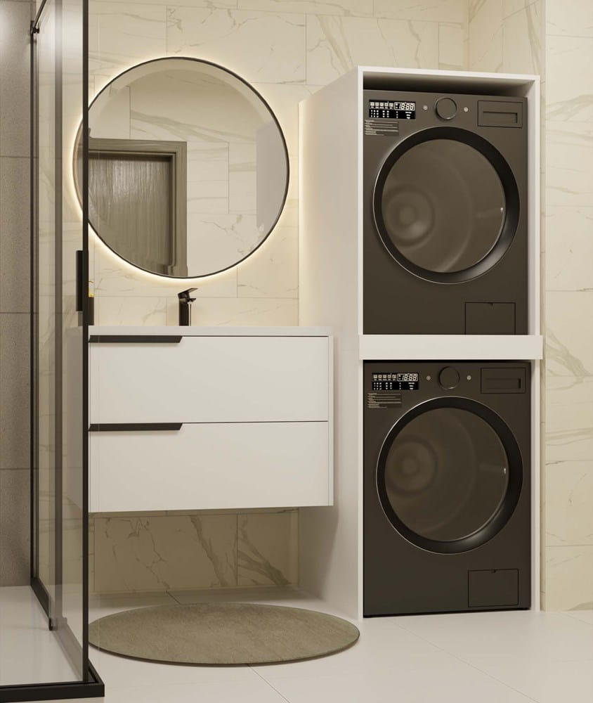 - Oszczędność miejsca – umożliwia ustawienie pralki i suszarki w pionie