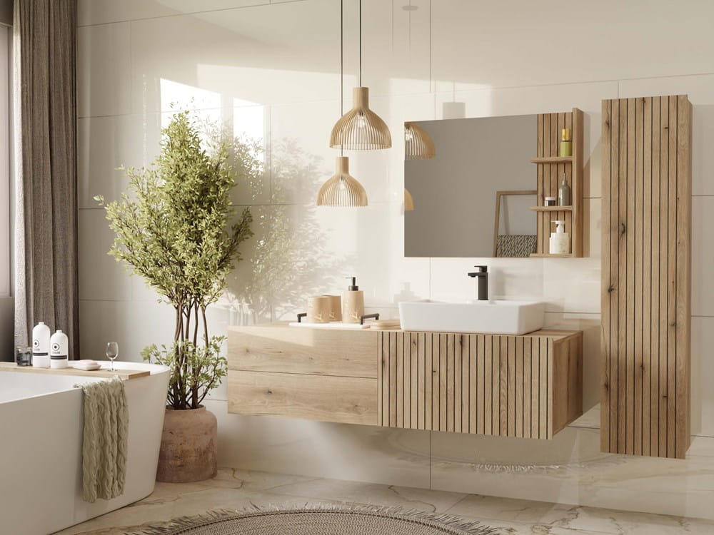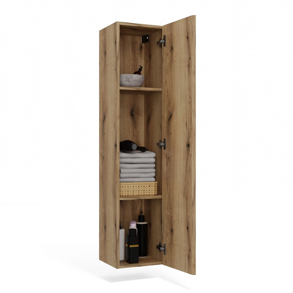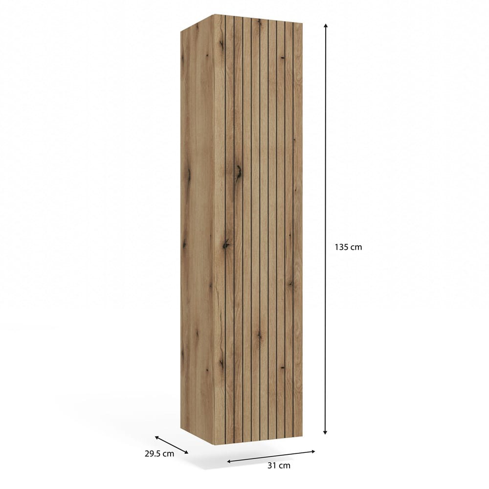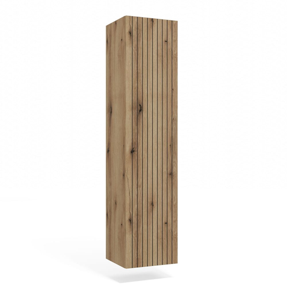 Szafka TIGO 1D w kolorze dąb evoke to elegancki słupek łazienkowy, który idealnie uzupełni nowoczesne wnętrze. Ryflowany front z pionowymi frezami nadaje jej oryginalny charakter i wprowadza dekoracyjny akcent do przestrzeni.