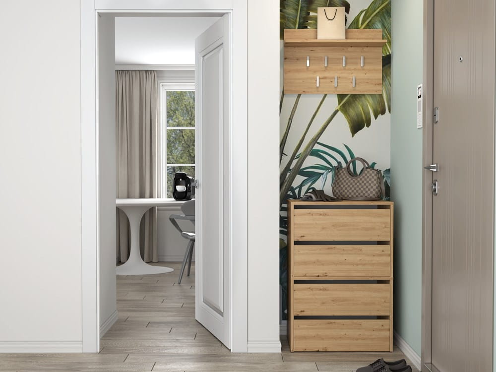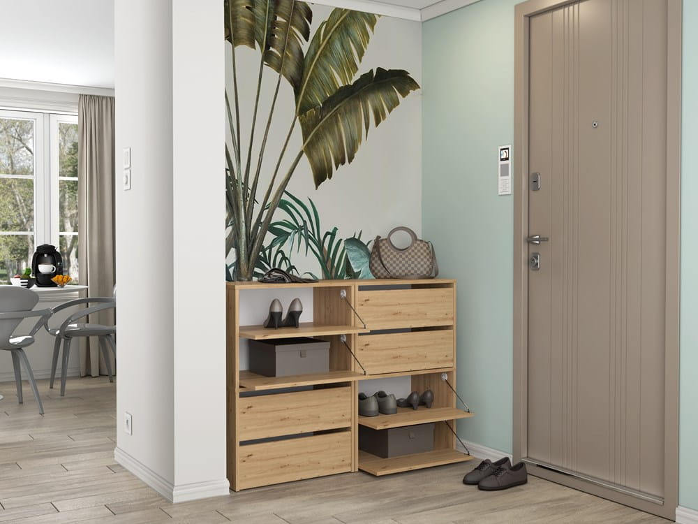 - Za drzwiczkami znajdują sie 4 pojemne półki na obuwie