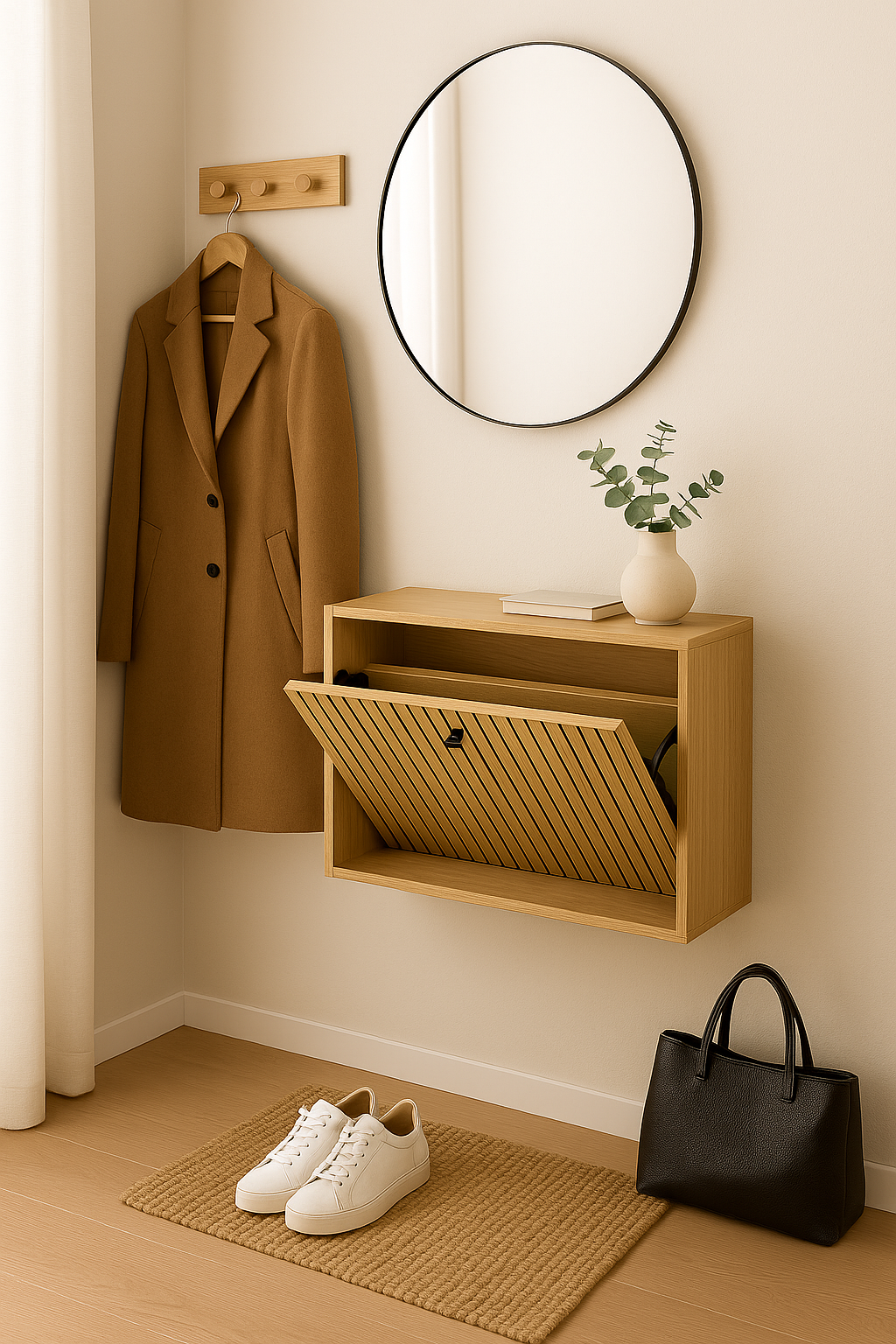 Dzięki możliwości montażu na ścianie, mebel pozwala zaoszczędzić miejsce i utrzymać porządek, jednocześnie ukrywając obuwie poza zasięgiem wzroku.