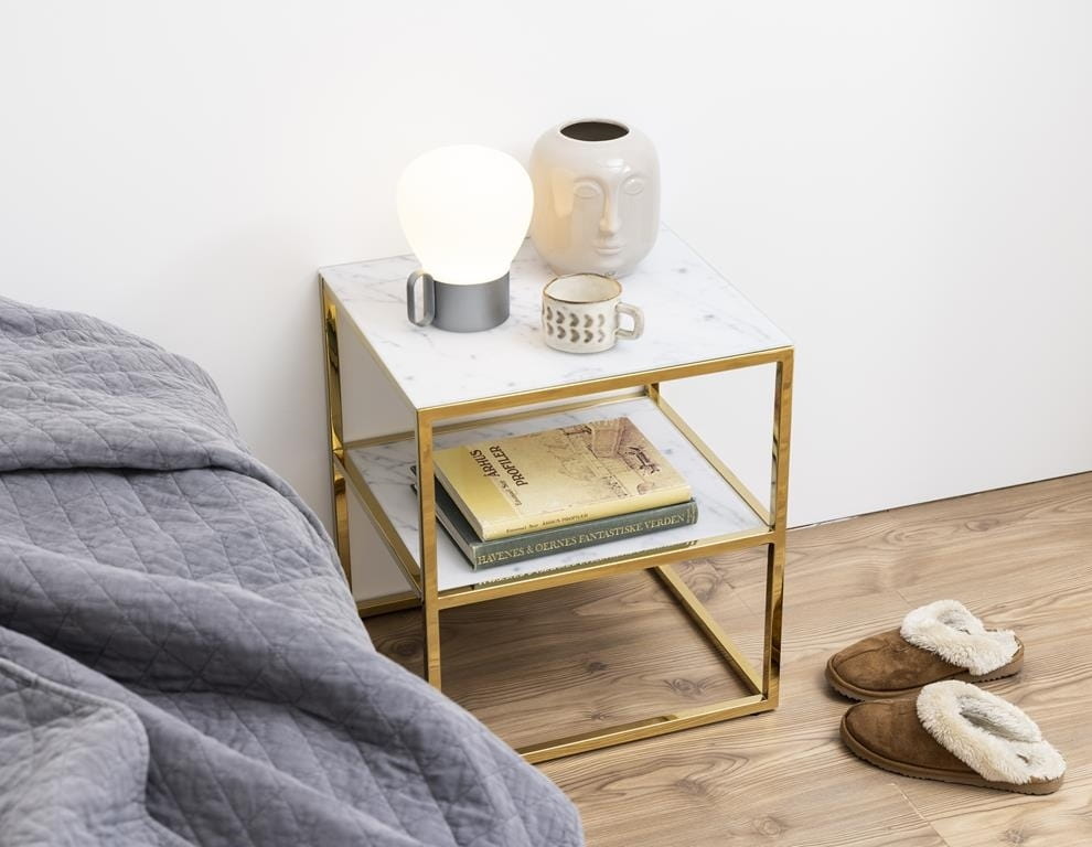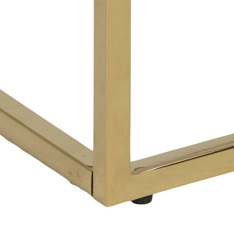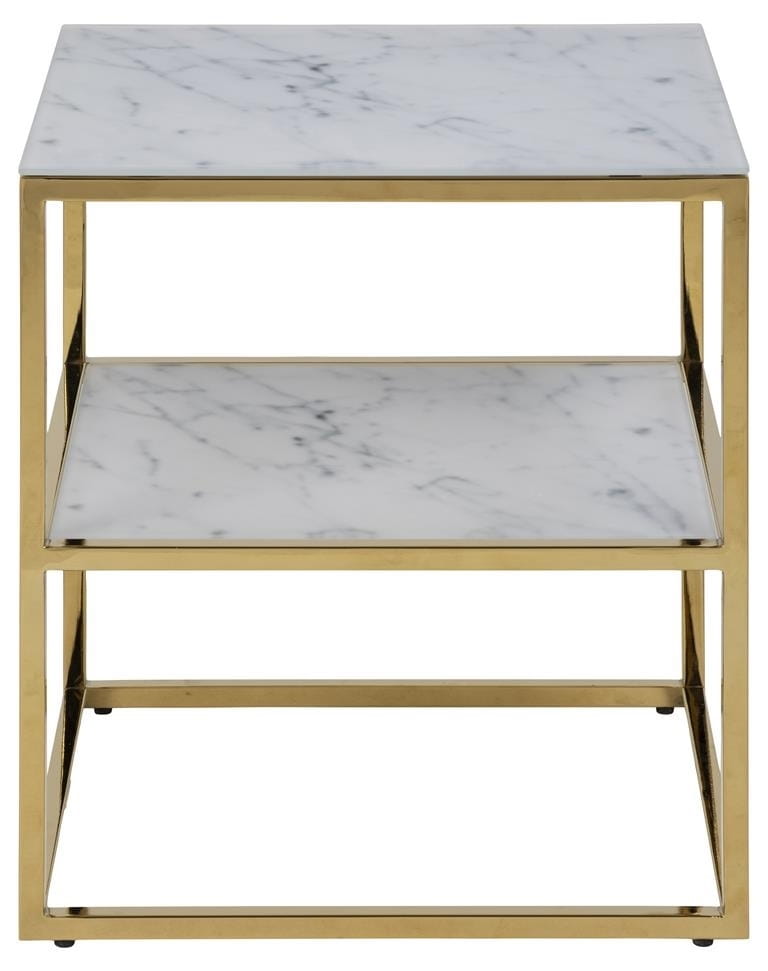 Posiada szkielet z chromowanego metalu w kolorze złotym oraz kwadratowy blat i półkę ze szkła pokryte wzorem imitującym biały marmur.