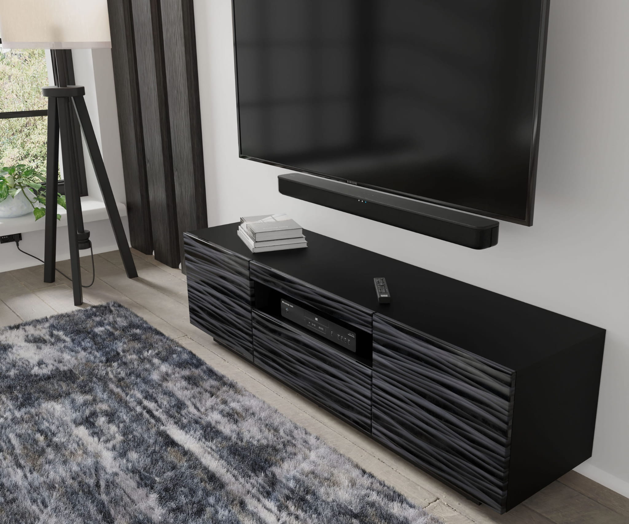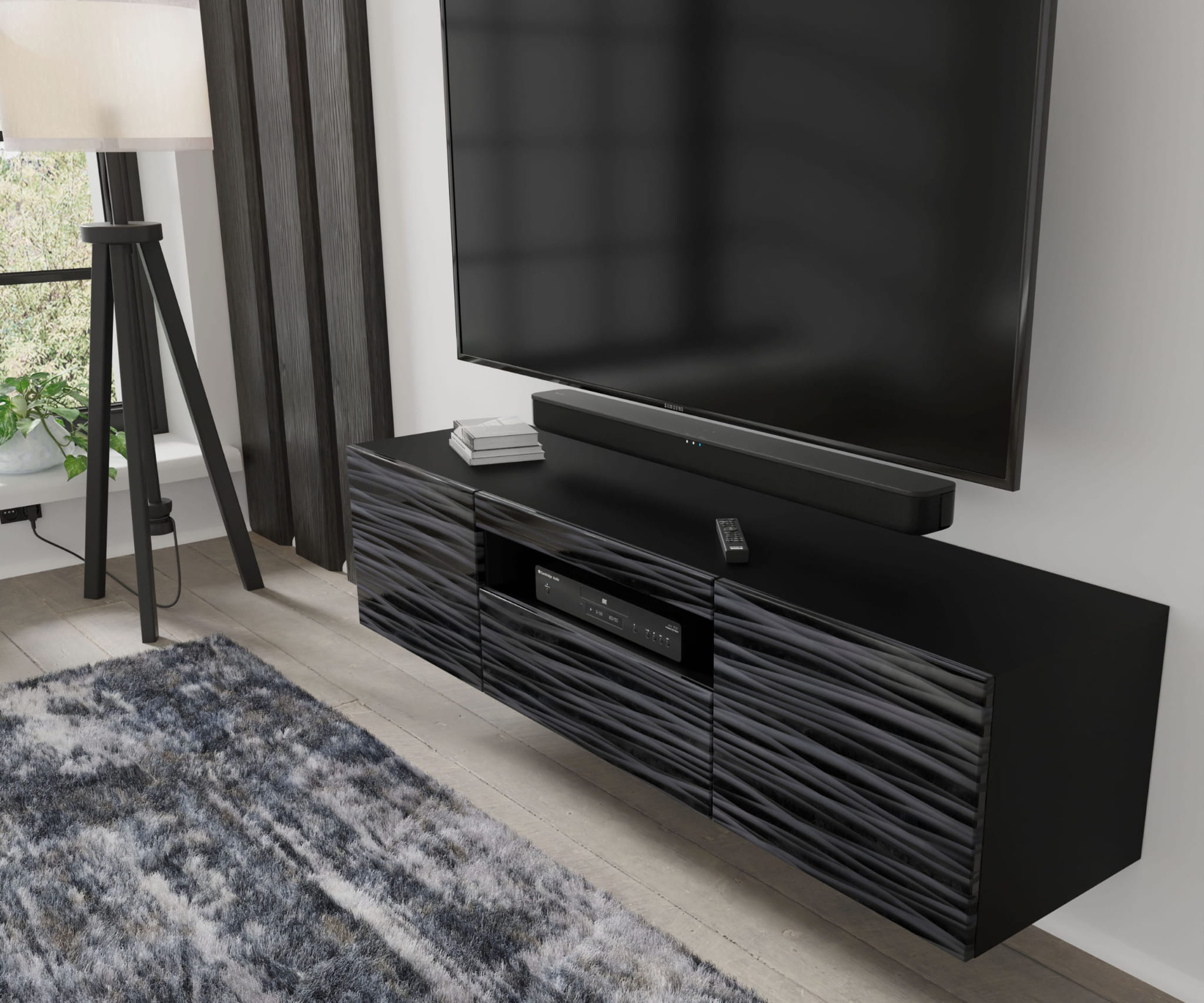 Czarna satyna frontów doskonale współgra z głęboką matową czernią korpusu, tworząc elegancką i wyrazistą kompozycję. Mebel może być zawieszony na ścianie lub ustawiony na opcjonalnych cokołach, dając pełną swobodę aranżacyjną.