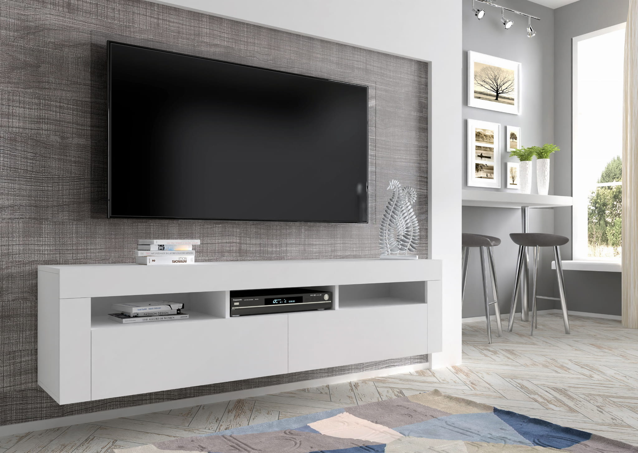 Funkcjonalność: Trzy otwarte półki idealne do przechowywania konsoli do gier, dekodera, książek czy innych drobiazgów, zapewniają łatwy dostęp do najczęściej używanych przedmiotów.